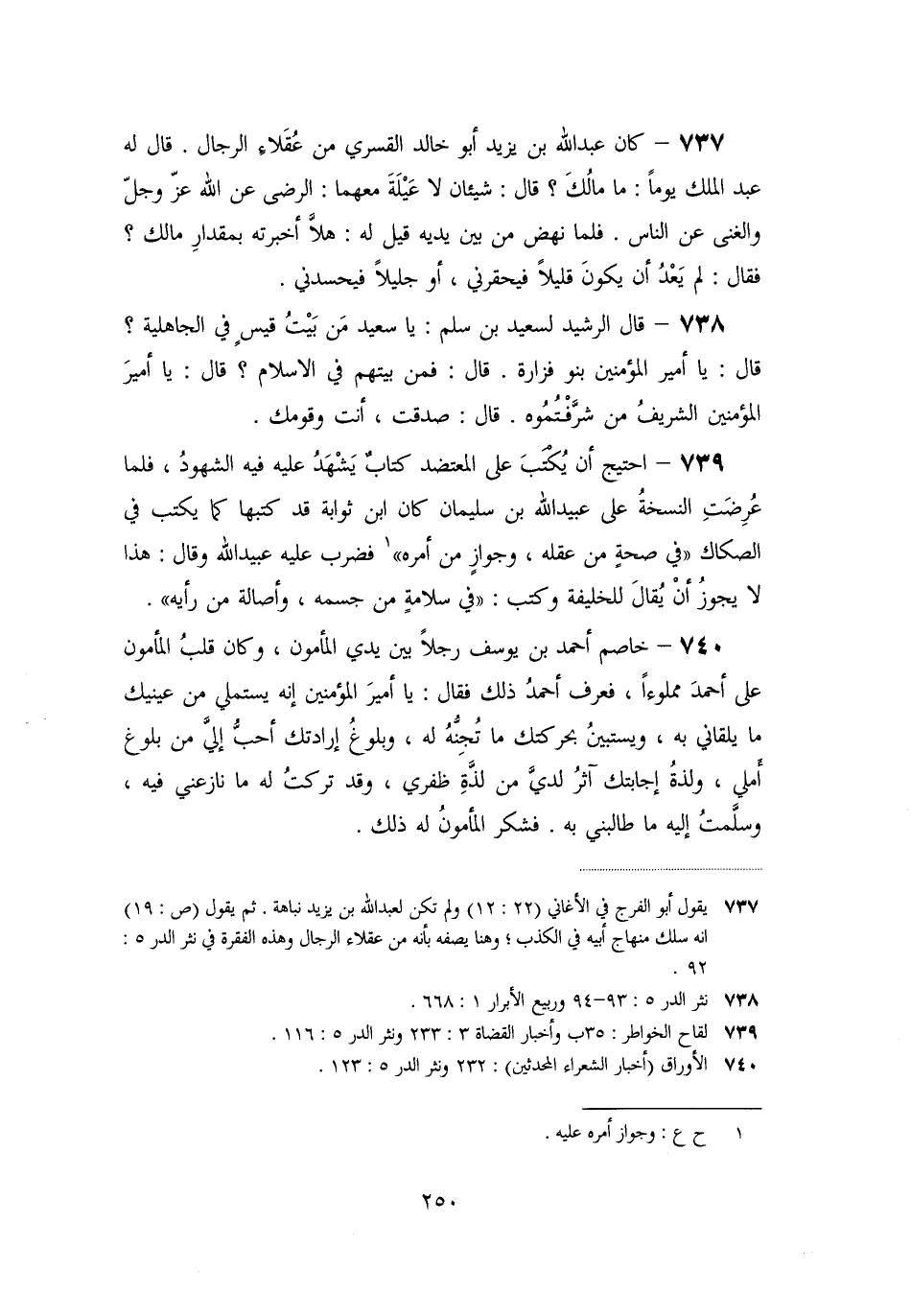 «740» - خاصم أحمد بن يوسف رجلا بين يدي المأمون، وكان قلب المأمون على أحمد مملوءا، فعرف أحمد ذلك فقال: يا أمير المؤمنين إنه يستملي من عينيك ما يلقاني به، ويستبين بحركتك ما تجنّه له، وبلوغ إرادتك أحبّ إليّ من بلوغ أملي، ولذة إجابتك آثر لديّ من لذّة ظفري، وقد تركت له ما نازعني فيه، وسلّمت إليه ما طالبني به. فشكر المأمون له ذلك.