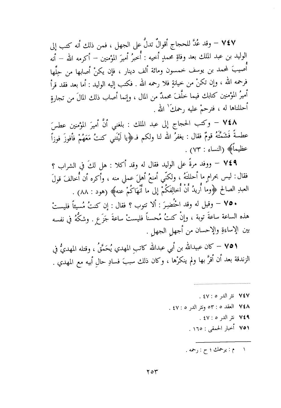 «748» - وكتب الحجاج إلى عبد الملك: بلغني أنّ أمير المؤمنين عطس عطسة فشمّته قوم فقال: يغفر الله لنا ولكم ف (يا لَيْتَنِي كُنْتُ مَعَهُمْ فَأَفُوزَ فَوْزاً عَظِيماً)