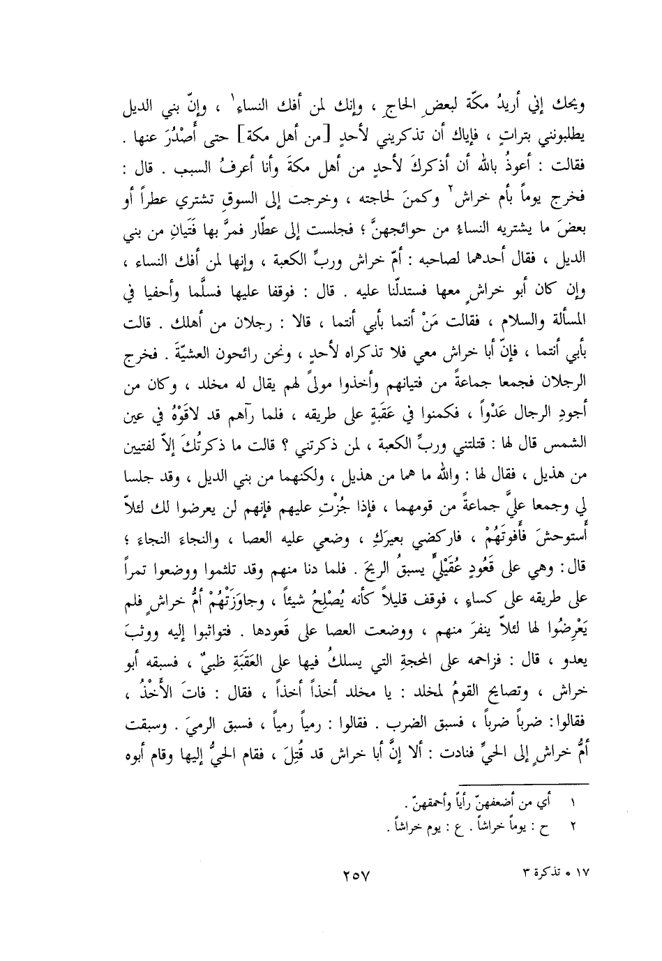 فخرج يوما بأم خراش [2] وكمن لحاجته، وخرجت إلى السوق تشتري عطرا أو بعض ما يشتريه النساء من حوائجهنّ؛ فجلست إلى عطّار فمرّ بها فتيان من بني الديل، فقال أحدهما لصاحبه: أمّ خراش وربّ الكعبة، وإنها لمن أفك النساء، وإن كان أبو خراش معها فستدلّنا عليه. قال: فوقفا عليها فسلّما وأحفيا في المسألة والسلام، فقالت من أنتما بأبي أنتما، قالا: رجلان من أهلك. قالت بأبي أنتما، فإنّ أبا خراش معي فلا تذكراه لأحد، ونحن رائحون العشيّة. فخرج الرجلان فجمعا جماعة من فتيانهم وأخذوا مولى لهم يقال له مخلد، وكان من أجود الرجال عدوا، فكمنوا في عقبة على طريقه، فلما رآهم قد لاقوه في عين الشمس قال لها: قتلتني وربّ الكعبة، لمن ذكرتني؟ قالت ما ذكرتك إلّا لفتيين من هذيل، فقال لها: والله ما هما من هذيل، ولكنهما من بني الديل، وقد جلسا لي وجمعا عليّ جماعة من قومهما، فإذا جزت عليهم فإنهم لن يعرضوا لك لئلّا أستوحش فأفوتهم، فاركضي بعيرك، وضعي عليه العصا، والنجاء النجاء؛ قال: وهي على قعود عقيليّ يسبق الريح. فلما دنا منهم وقد تلثموا ووضعوا تمرا على طريقه على كساء، فوقف قليلا كأنه يصلح شيئا، وجاوزتهم أمّ خراش فلم يعرضوا لها لئلّا ينفر منهم، ووضعت العصا على قعودها. فتواثبوا إليه ووثب يعدو، قال: فزاحمه على المحجة التي يسلك فيها على العقبة ظبي، فسبقه أبو خراش، وتصايح القوم لمخلد: يا مخلد أخذا أخذا، فقال: فات الأخذ، فقالوا: ضربا ضربا، فسبق الضرب. فقالوا: رميا رميا، فسبق الرمي. وسبقت أمّ خراش إلى الحيّ فنادت: ألا إنّ أبا خراش قد قتل، فقام الحيّ إليها وقام أبوه