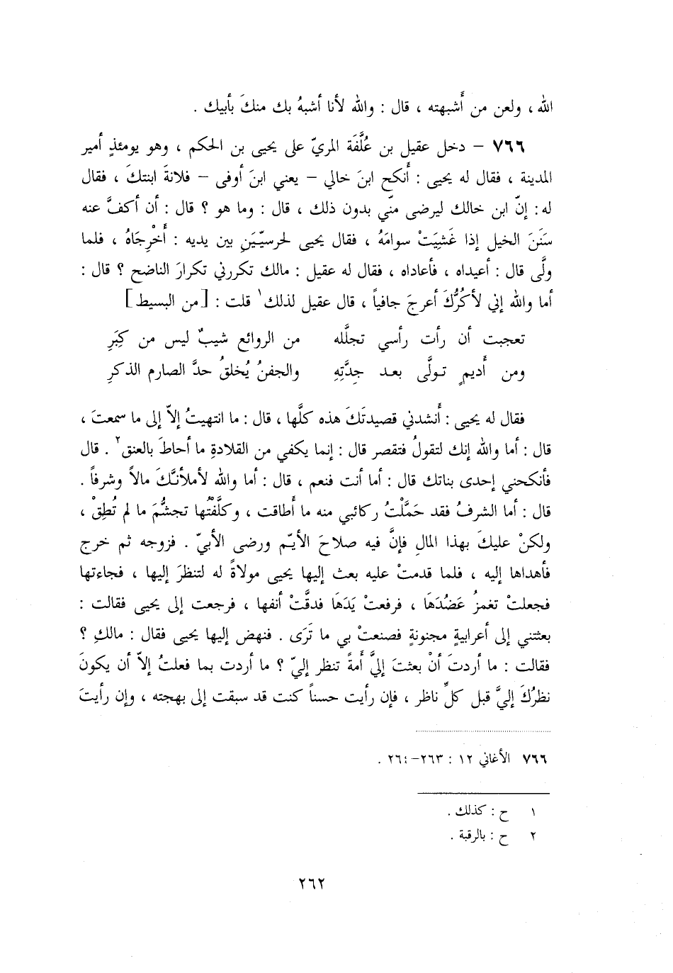 «766» - دخل عقيل بن علّفة المريّ على يحيى بن الحكم، وهو يومئذ أمير المدينة، فقال له يحيى: أنكح ابن خالي- يعني ابن أوفى- فلانة ابنتك، فقال له: إنّ ابن خالك ليرضى منّي بدون ذلك، قال: وما هو؟ قال: أن أكفّ عنه سنن الخيل إذا غشيت سوامه، فقال يحيى لحرسيّين بين يديه: أخرجاه، فلما ولّى قال: أعيداه، فأعاداه، فقال له عقيل: مالك تكررني تكرار الناضح؟ قال:
