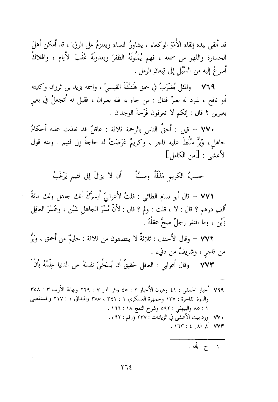 «770» - قيل: أحقّ الناس بالرحمة ثلاثة: عاقل قد نفذت عليه أحكام جاهل، وبرّ سلّط عليه فاجر، وكريم عرضت له حاجة إلى لئيم. ومنه قول الأعشى: [من الكامل]