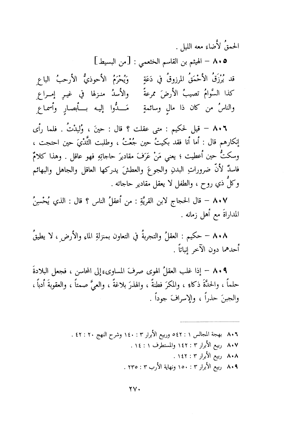 «806» - قيل لحكيم: متى عقلت؟ قال: حين، ولدت. فلما رأى إنكارهم قال: أما أنا فقد بكيت حين جعت، وطلبت الثّدي حين احتجت، وسكتّ حين أعطيت؛ يعني من عرف مقادير حاجاته فهو عاقل. وهذا كلام فاسد لأنّ ضرورات البدن والجوع والعطش يدركها العاقل والجاهل والبهائم وكلّ ذي روح، والطفل لا يعقل مقادير حاجاته.