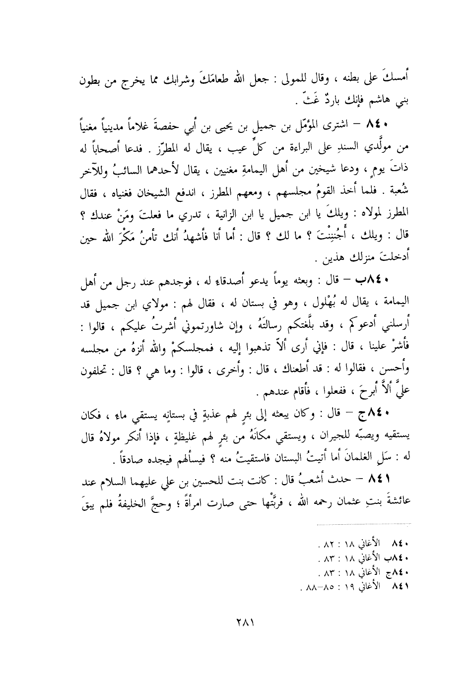 «840» - اشترى المؤمّل بن جميل بن يحيى بن أبي حفصة غلاما مدينيا مغنيا من مولّدي السند على البراءة من كلّ عيب، يقال له المطرّز. فدعا أصحابا له ذات يوم، ودعا شيخين من أهل اليمامة مغنيين، يقال لأحدهما السائب وللآخر شعبة. فلما أخذ القوم مجلسهم، ومعهم المطرز، اندفع الشيخان فغنياه، فقال المطرز لمولاه: ويلك يا ابن جميل يا ابن الزانية، تدري ما فعلت ومن عندك؟