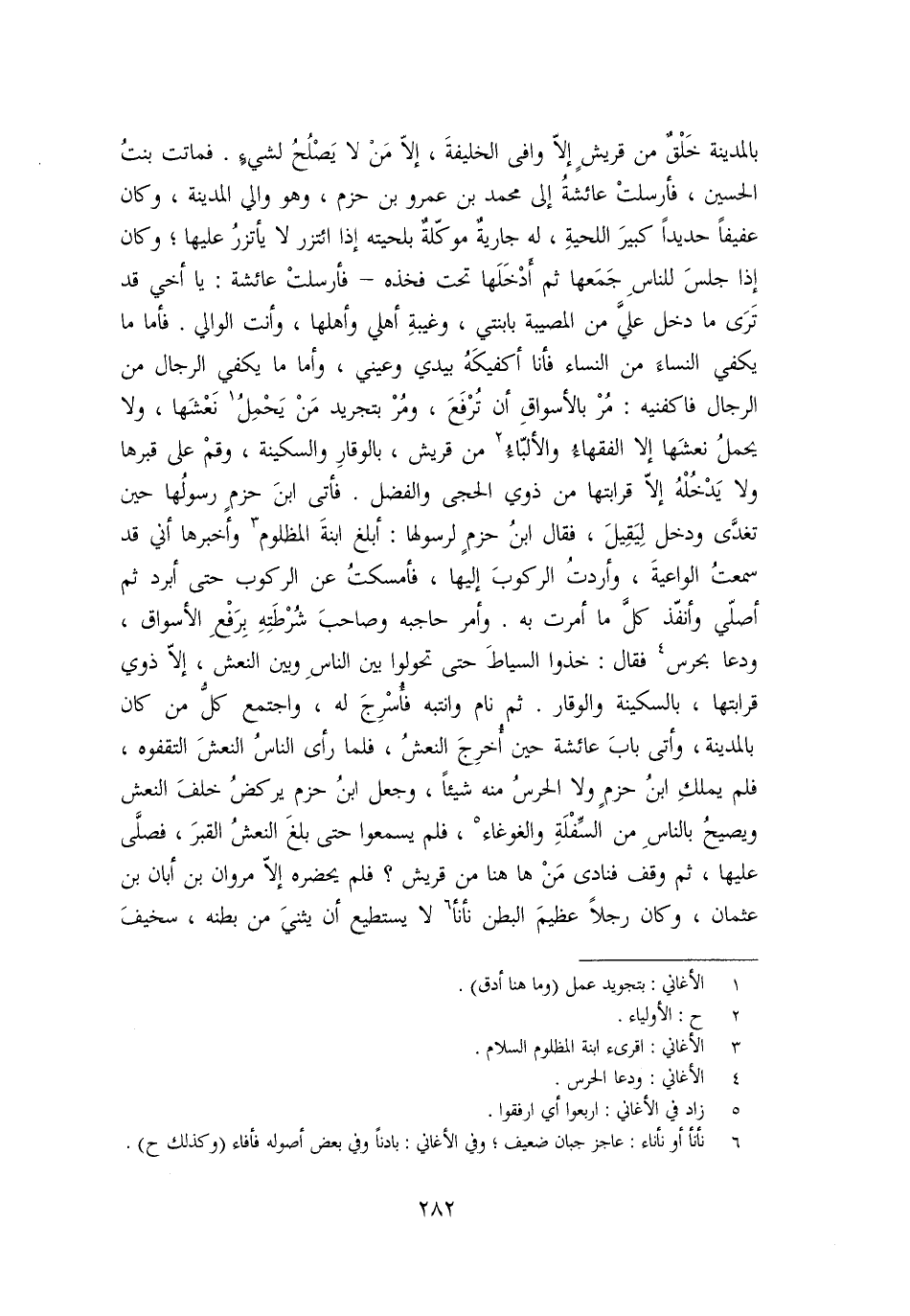 بالمدينة خلق من قريش إلّا وافى الخليفة، إلّا من لا يصلح لشيء. فماتت بنت الحسين، فأرسلت عائشة إلى محمد بن عمرو بن حزم، وهو وإلى المدينة، وكان عفيفا حديدا كبير اللحية، له جارية موكّلة بلحيته إذا ائتزر لا يأتزر عليها؛ وكان إذا جلس للناس جمعها ثم أدخلها تحت فخذه- فأرسلت عائشة: يا أخي قد ترى ما دخل عليّ من المصيبة بابنتي، وغيبة أهلي وأهلها، وأنت الوالي. فأما ما يكفي النساء من النساء فأنا أكفيكه بيدي وعيني، وأما ما يكفي الرجال من الرجال فاكفنيه: مر بالأسواق أن ترفع، ومر بتجريد من يحمل [1] نعشها، ولا يحمل نعشها إلا الفقهاء والألبّاء [2] من قريش، بالوقار والسكينة، وقم على قبرها ولا يدخله إلّا قرابتها من ذوي الحجى والفضل. فأتى ابن حزم رسولها حين تغدّى ودخل ليقيل، فقال ابن حزم لرسولها: أبلغ ابنة المظلوم [3] وأخبرها أني قد سمعت الواعية، وأردت الركوب إليها، فأمسكت عن الركوب حتى أبرد ثم أصلّي وأنفّذ كلّ ما أمرت به. وأمر حاجبه وصاحب شرطته برفع الأسواق، ودعا بحرس [4] فقال: خذوا السياط حتى تحولوا بين الناس وبين النعش، إلا ذوي قرابتها، بالسكينة والوقار. ثم نام وانتبه فأسرج له، واجتمع كلّ من كان بالمدينة، وأتى باب عائشة حين أخرج النعش، فلما رأى الناس النعش التقفوه، فلم يملك ابن حزم ولا الحرس منه شيئا، وجعل ابن حزم يركض خلف النعش ويصيح بالناس من السّفلة والغوغاء [5] ، فلم يسمعوا حتى بلغ النعش القبر، فصلّى عليها، ثم وقف فنادى من ها هنا من قريش؟ فلم يحضره إلّا مروان بن أبان بن عثمان، وكان رجلا عظيم البطن نأنأ [6] لا يستطيع أن يثني من بطنه، سخيف