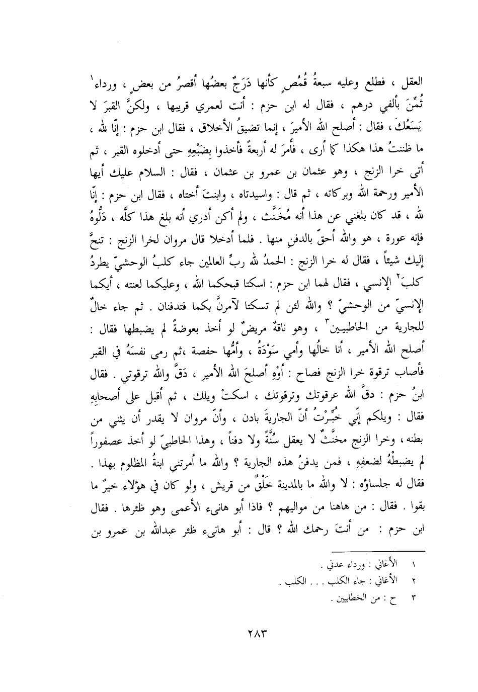 العقل، فطلع وعليه سبعة قمص كأنها درج بعضها أقصر من بعض، ورداء [1] ثمّن بألفي درهم، فقال له ابن حزم: أنت لعمري قريبها، ولكنّ القبر لا يسعك، فقال: أصلح الله الأمير، إنما تضيق الأخلاق، فقال ابن حزم: إنّا لله، ما ظننت هذا هكذا كما أرى، فأمر له أربعة فأخذوا بضبعه حتى أدخلوه القبر، ثم أتى خرا الزنج، وهو عثمان بن عمرو بن عثمان، فقال: السلام عليك أيها الأمير ورحمة الله وبركاته، ثم قال: واسيدتاه، وابنت أختاه، فقال ابن حزم: إنّا لله، قد كان بلغني عن هذا أنه مخنّث، ولم أكن أدري أنه بلغ هذا كلّه، دلّوه فإنه عورة، هو والله أحقّ بالدفن منها. فلما أدخلا قال مروان لخرا الزنج: تنحّ إليك شيئا، فقال له خرا الزنج: الحمد لله ربّ العالمين جاء كلب الوحشيّ يطرد كلب [2] الإنسي، فقال لهما ابن حزم: اسكتا قبحكما الله، وعليكما لعنته، أيكما الإنسيّ من الوحشيّ؟ والله لئن لم تسكتا لآمرنّ بكما فتدفنان. ثم جاء خال للجارية من الحاطبيين [3] ، وهو ناقه مريض لو أخذ بعوضة لم يضبطها فقال: