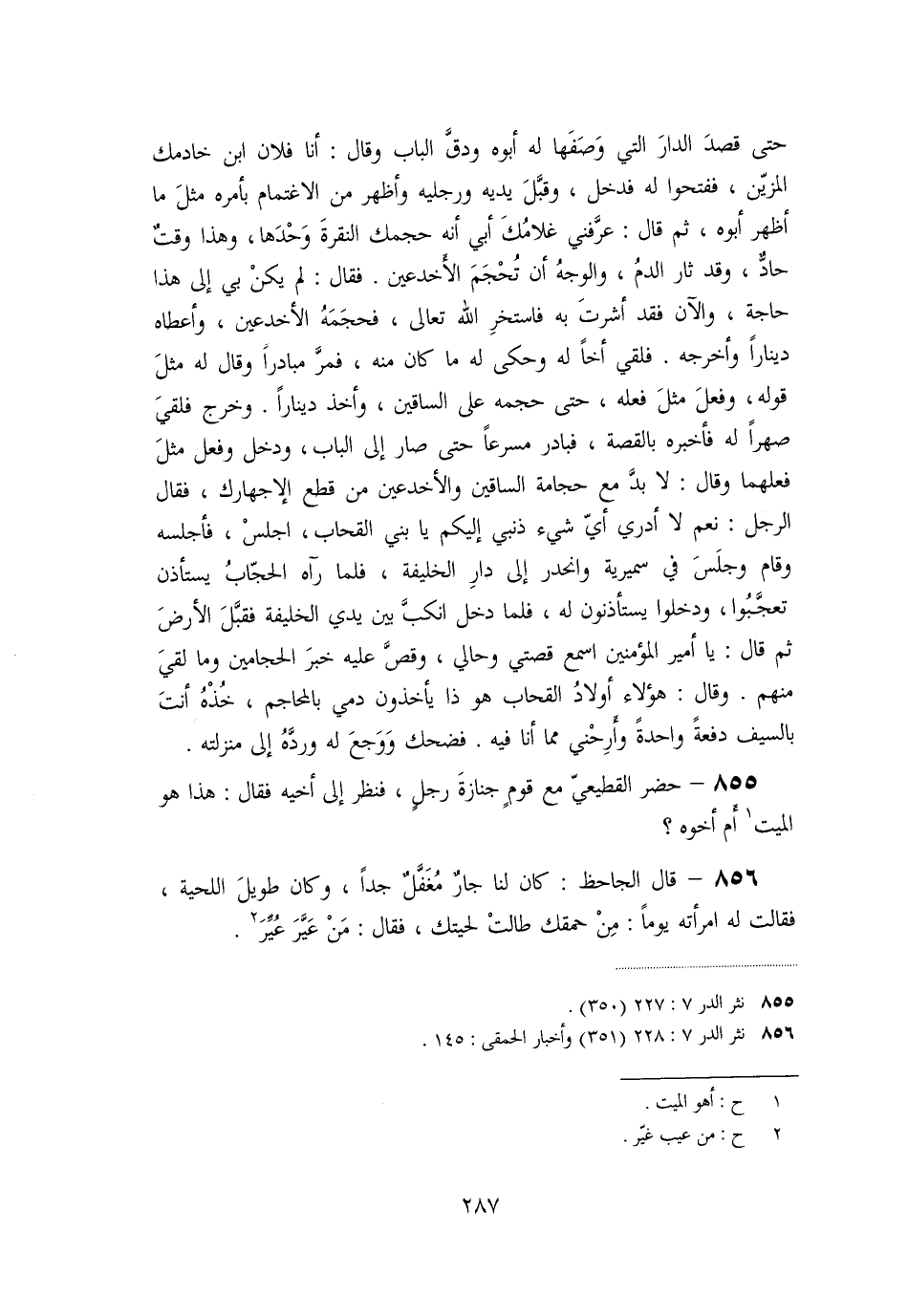 «855» - حضر القطيعيّ مع قوم جنازة رجل، فنظر إلى أخيه فقال: هذا هو الميت [1] أم أخوه؟
