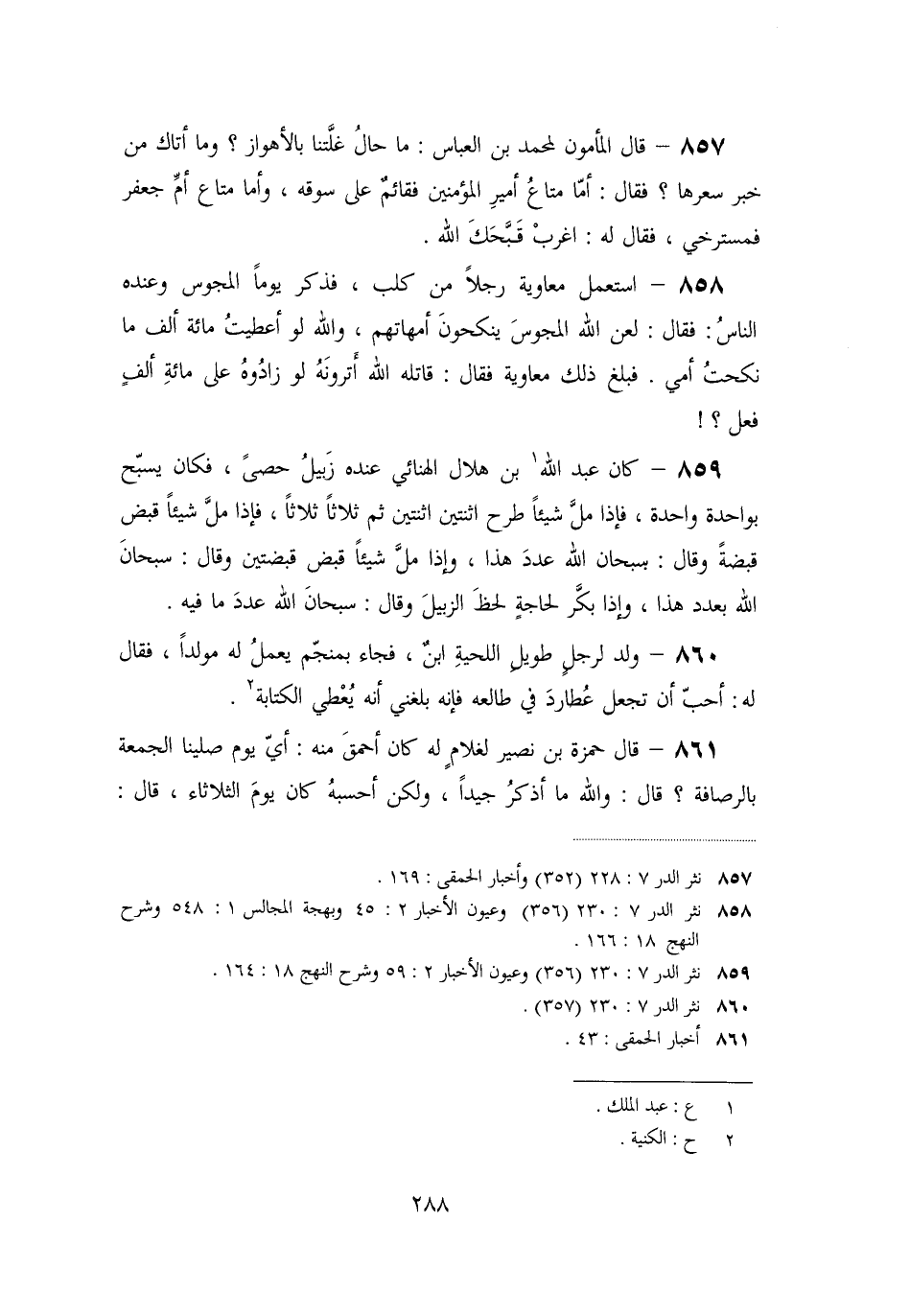«858» - استعمل معاوية رجلا من كلب، فذكر يوما المجوس وعنده الناس: فقال: لعن الله المجوس ينكحون أمهاتهم، والله لو أعطيت مائة ألف ما نكحت أمي. فبلغ ذلك معاوية فقال: قاتله الله أترونه لو زادوه على مائة ألف فعل؟! «859» - كان عبد الله [1] بن هلال الهنائي عنده زبيل حصى، فكان يسبّح بواحدة واحدة، فإذا ملّ شيئا طرح اثنتين اثنتين ثم ثلاثا، ثلاثا، فإذا ملّ شيئا قبض قبضة وقال: سبحان الله عدد هذا، وإذا ملّ شيئا قبض قبضتين وقال: سبحان الله بعدد هذا، وإذا بكّر لحاجة لحظ الزبيل وقال: سبحان الله عدد ما فيه.