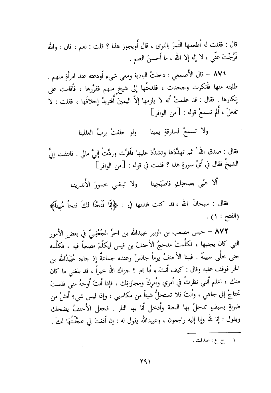871- قال الأصمعي: دخلت البادية ومعي شيء أودعته عند امرأة منهم.