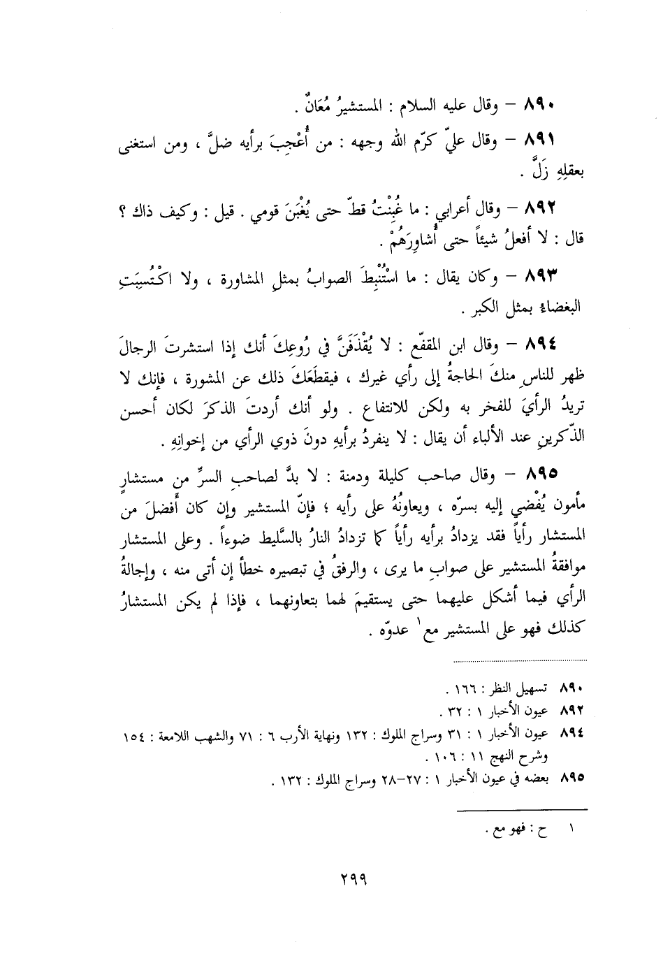 «894» - وقال ابن المقفّع: لا يقذفنّ في روعك أنك إذا استشرت الرجال ظهر للناس منك الحاجة إلى رأي غيرك، فيقطعك ذلك عن المشورة، فإنك لا تريد الرأي للفخر به ولكن للانتفاع. ولو أنك أردت الذكر لكان أحسن الذّكرين عند الألباء أن يقال: لا ينفرد برأيه دون ذوي الرأي من إخوانه.
