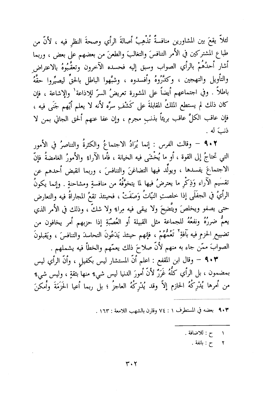 902- وقالت الفرس: إنما يراد الاجتماع والكثرة والتناصر في الأمور التي تحتاج إلى القوة، أو ما يخشى فيه الخيانة، فأما الآراء والأمور الغامضة فإنّ الاجتماع يفسدها، ويولّد فيها التضاغن والتنافس، وربما انقبض أحدهم عن تقسيم الآراء وذكر ما يعترض فيها لما يتخوّفه من منافسة ومشاحنة. وإنما يكون الرأي في الجفلى إذا خلصت النيّات وصفت، فحينئذ تقع المجاراة فيه والتعارض حتى يصفو ويخلص ويتّضح ولا يبقى فيه مراء ولا شكّ، وذلك في الأمر الذي يعمّ ضرره ونفعه للجماعة مثل القبيلة أو العصبة إذا حزبهم أمر يخافون من تضييع الحزم فيه بآفة [2] تعمّهم، فإنهم حينئذ يدعون التحاسد والتنافس، ويقبلون الصواب ممّن جاء به منهم لأنّ صلاح ذلك يعمّهم والخطأ فيه يشملهم.