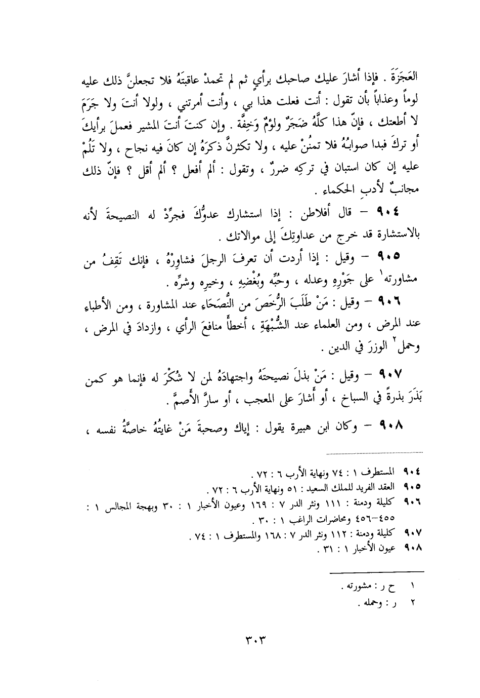 «905» - وقيل: إذا أردت أن تعرف الرجل فشاوره، فإنك تقف من مشاورته [1] على جوره وعدله، وحبّه وبغضه، وخيره وشرّه.