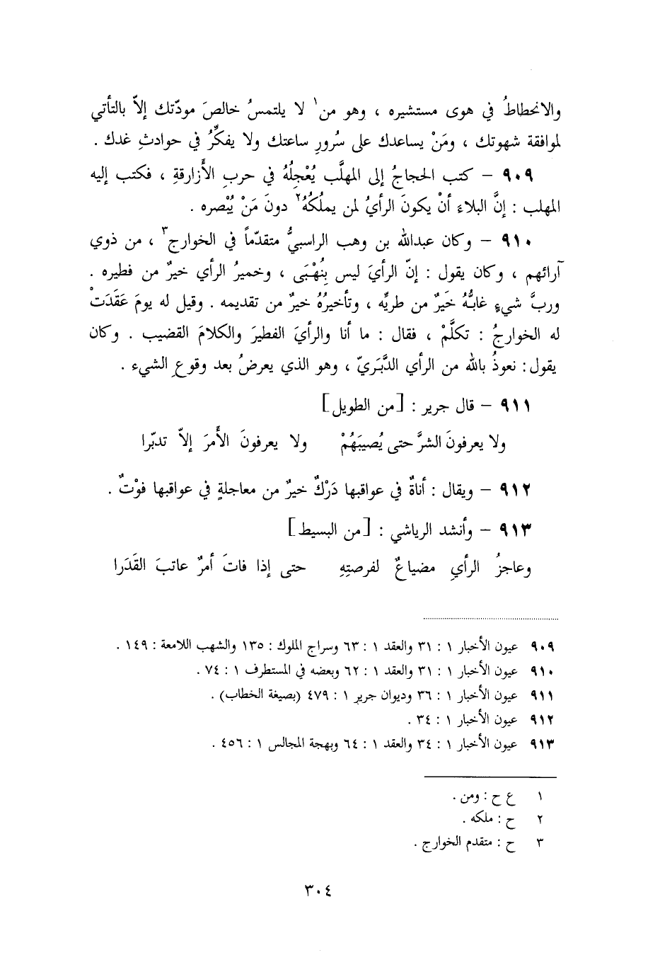 «909» - كتب الحجاج إلى المهلّب يعجله في حرب الأزارقة، فكتب إليه المهلب: إنّ البلاء أن يكون الرأي لمن يملكه [2] دون من يبصره.