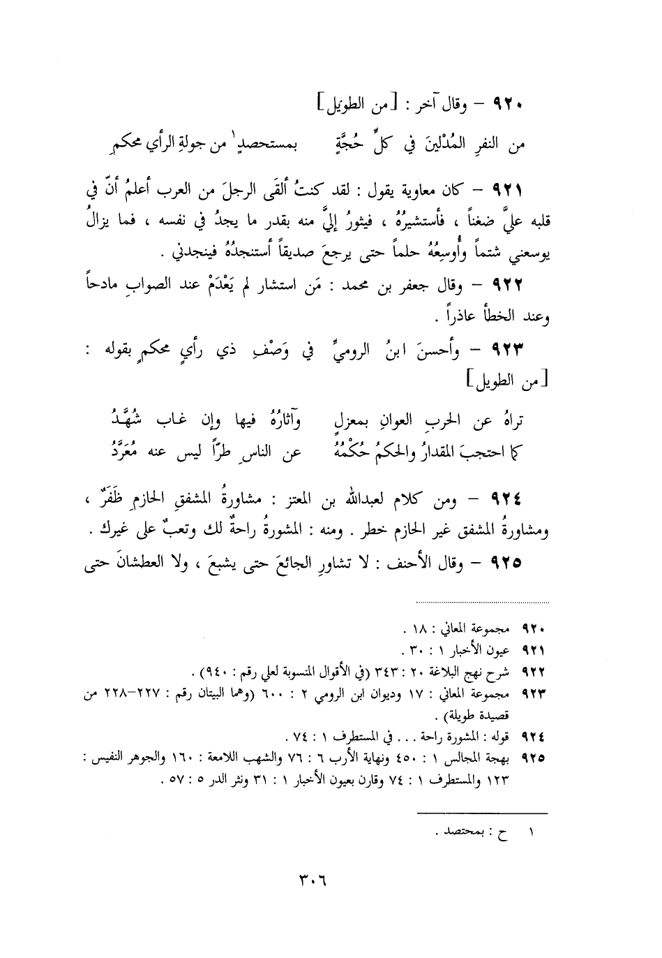 «924» - ومن كلام لعبد الله بن المعتز: مشاورة المشفق الحازم ظفر، ومشاورة المشفق غير الحازم خطر. ومنه: المشورة راحة لك وتعب على غيرك.