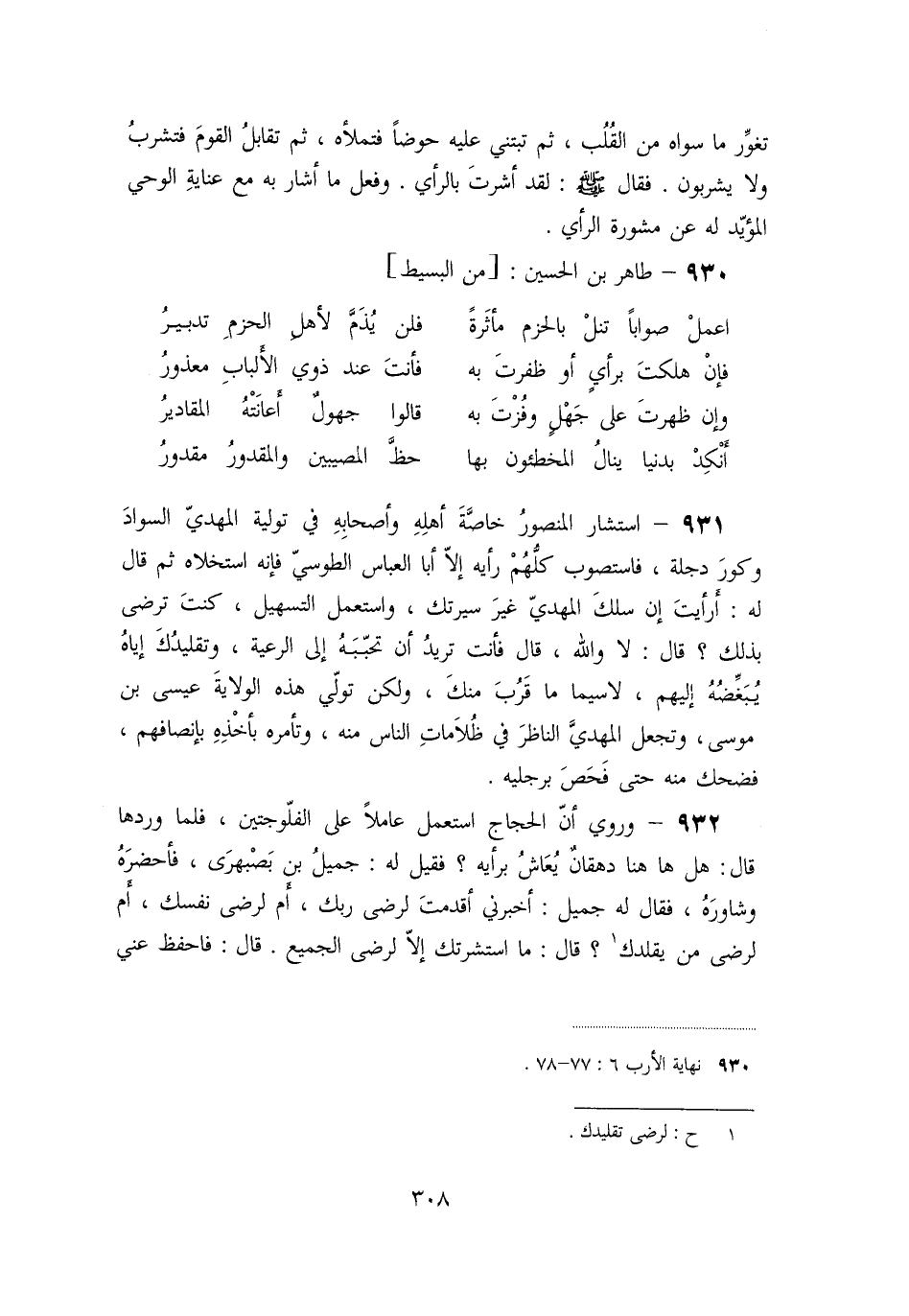 931- استشار المنصور خاصّة أهله وأصحابه في تولية المهديّ السواد وكور دجلة، فاستصوب كلّهم رأيه إلّا أبا العباس الطوسيّ فإنه استخلاه ثم قال له: أرأيت إن سلك المهديّ غير سيرتك، واستعمل التسهيل، كنت ترضى بذلك؟ قال: لا والله، قال فأنت تريد أن تحبّبه إلى الرعية، وتقليدك إياه يبغّضه إليهم، لا سيما ما قرب منك، ولكن تولّي هذه الولاية عيسى بن موسى، وتجعل المهديّ الناظر في ظلامات الناس منه، وتأمره بأخذه بإنصافهم، فضحك منه حتى فحص برجليه.