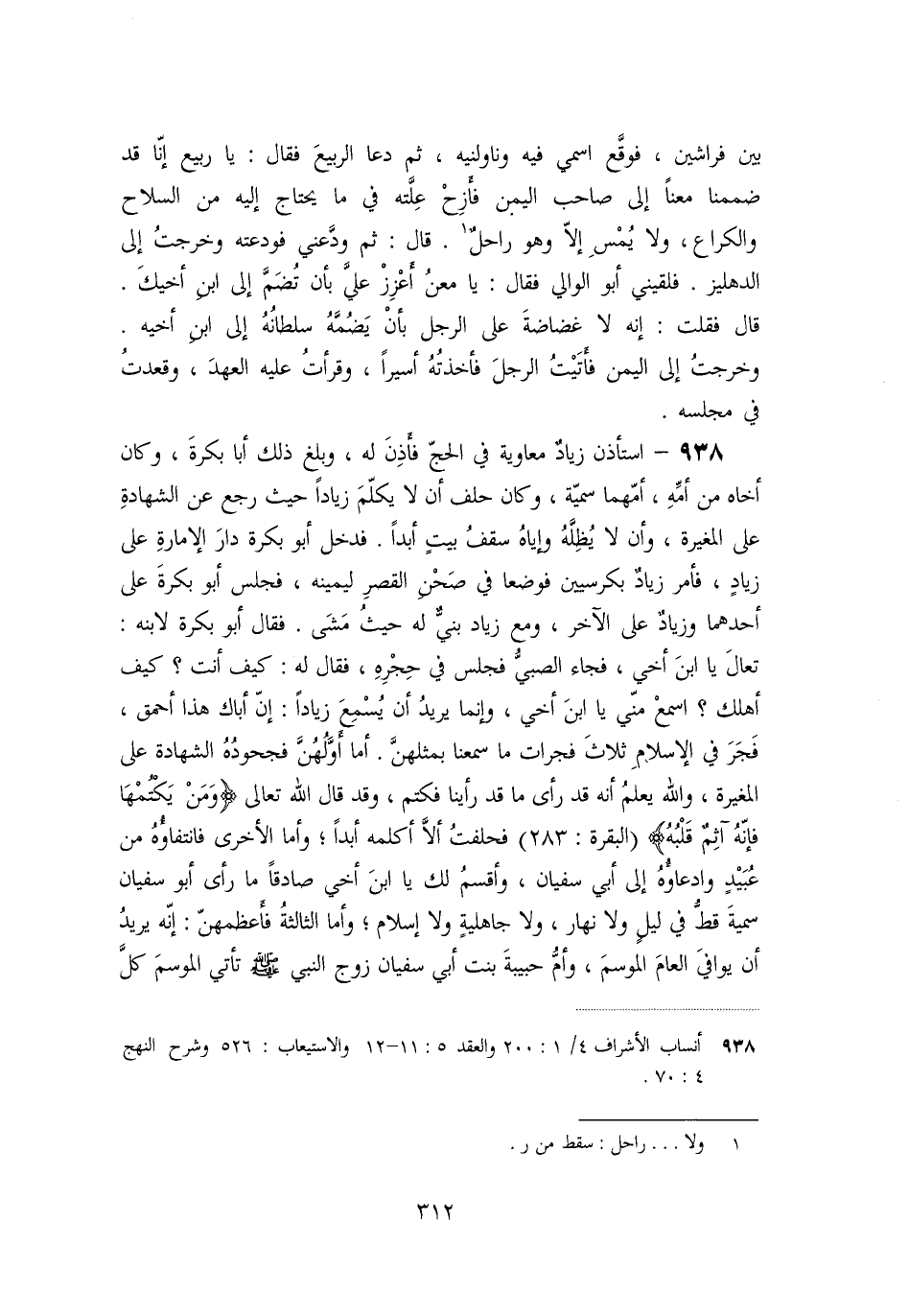 «938» - استأذن زياد معاوية في الحجّ فأذن له، وبلغ ذلك أبا بكرة، وكان أخاه من أمّه، أمّهما سميّة، وكان حلف أن لا يكلّم زيادا حيث رجع عن الشهادة على المغيرة، وأن لا يظلّه وإياه سقف بيت أبدا. فدخل أبو بكرة دار الإمارة على زياد، فأمر زياد بكرسيين فوضعا في صحن القصر ليمينه، فجلس أبو بكرة على أحدهما وزياد على الآخر، ومع زياد بنيّ له حيث مشى. فقال أبو بكرة لابنه: