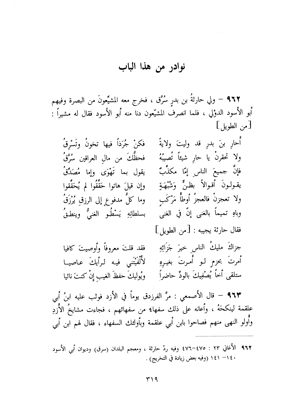 «962» - ولي حارثة بن بدر سرّق، فخرج معه المشيّعون من البصرة وفيهم أبو الأسود الدؤلي، فلما انصرف المشيّعون دنا منه أبو الأسود فقال له مشيرا: