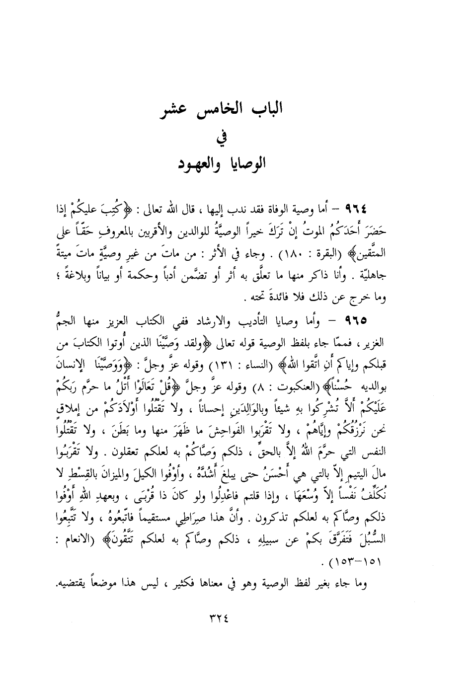 (العنكبوت: 8) وقوله عزّ وجلّ (قُلْ تَعالَوْا أَتْلُ ما حَرَّمَ رَبُّكُمْ عَلَيْكُمْ أَلَّا تُشْرِكُوا بِهِ شَيْئاً وَبِالْوالِدَيْنِ إِحْساناً، وَلا تَقْتُلُوا أَوْلادَكُمْ مِنْ إِمْلاقٍ نَحْنُ نَرْزُقُكُمْ وَإِيَّاهُمْ، وَلا تَقْرَبُوا الْفَواحِشَ ما ظَهَرَ مِنْها وَما بَطَنَ، وَلا تَقْتُلُوا النَّفْسَ الَّتِي حَرَّمَ اللَّهُ إِلَّا بِالْحَقِّ، ذلِكُمْ وَصَّاكُمْ بِهِ لَعَلَّكُمْ تَعْقِلُونَ. وَلا تَقْرَبُوا مالَ الْيَتِيمِ إِلَّا بِالَّتِي هِيَ أَحْسَنُ حَتَّى يَبْلُغَ أَشُدَّهُ، وَأَوْفُوا الْكَيْلَ وَالْمِيزانَ بِالْقِسْطِ لا نُكَلِّفُ نَفْساً إِلَّا وُسْعَها، وَإِذا قُلْتُمْ فَاعْدِلُوا وَلَوْ كانَ ذا قُرْبى، وَبِعَهْدِ اللَّهِ أَوْفُوا ذلِكُمْ وَصَّاكُمْ بِهِ لَعَلَّكُمْ تَذَكَّرُونَ. وَأَنَّ هذا صِراطِي مُسْتَقِيماً فَاتَّبِعُوهُ، وَلا تَتَّبِعُوا السُّبُلَ فَتَفَرَّقَ بِكُمْ عَنْ سَبِيلِهِ، ذلِكُمْ وَصَّاكُمْ بِهِ لَعَلَّكُمْ تَتَّقُونَ)