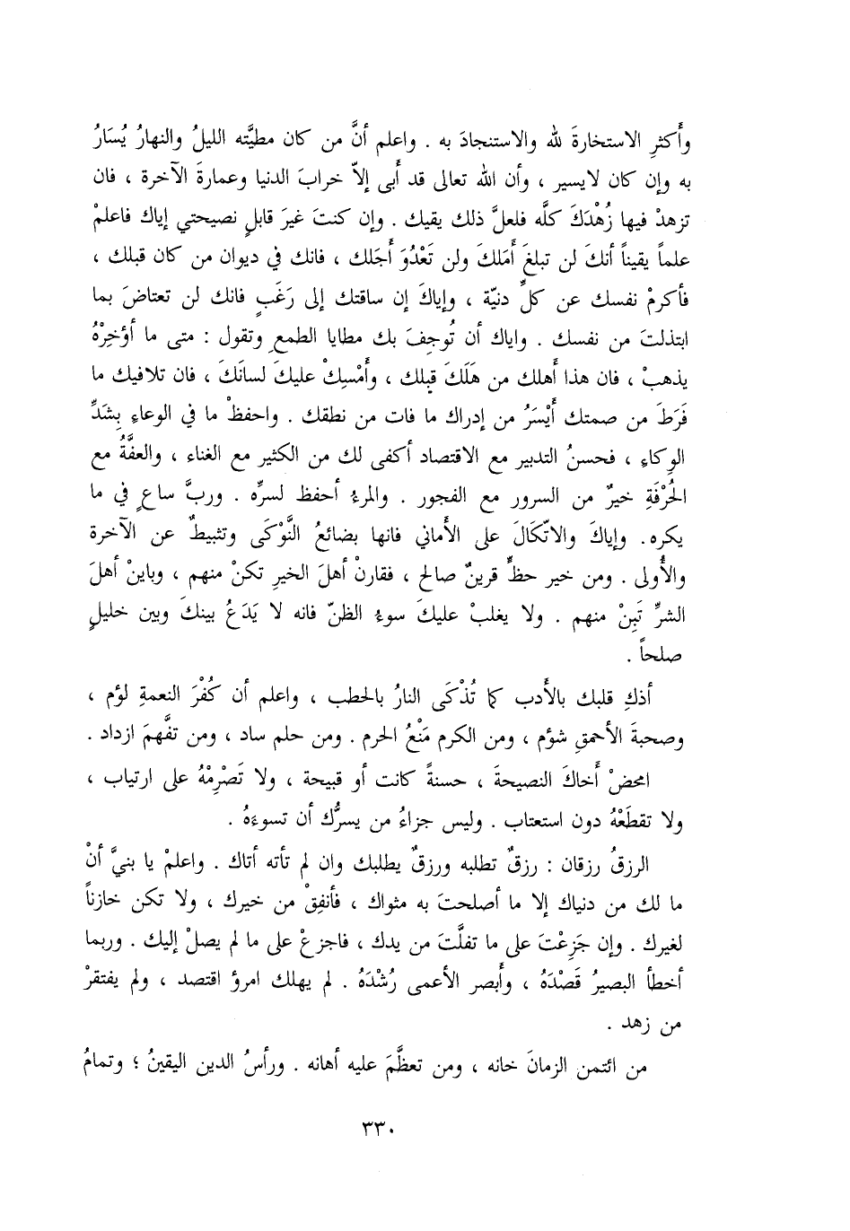 وأكثر الاستخارة لله والاستنجاد به. واعلم أنّ من كان مطيّته الليل والنهار يسار به وإن كان لا يسير، وأن الله تعالى قد أبى إلّا خراب الدنيا وعمارة الآخرة، فان تزهد فيها زهدك كلّه فلعلّ ذلك يقيك. وإن كنت غير قابل نصيحتي إياك فاعلم علما يقينا أنك لن تبلغ أملك ولن تعدو أجلك، فانك في ديوان من كان قبلك، فأكرم نفسك عن كلّ دنيّة، وإياك إن ساقتك إلى رغب فانك لن تعتاض بما ابتذلت من نفسك. واياك أن توجف بك مطايا الطمع وتقول: متى ما أؤخره يذهب، فان هذا أهلك من هلك قبلك، وأمسك عليك لسانك، فان تلافيك ما فرط من صمتك أيسر من إدراك ما فات من نطقك. واحفظ ما في الوعاء بشدّ الوكاء، فحسن التدبير مع الاقتصاد أكفى لك من الكثير مع الغناء، والعفّة مع الحرفة خير من السرور مع الفجور. والمرء أحفظ لسرّه. وربّ ساع في ما يكره. وإياك والاتّكال على الأماني فانها بضائع النّوكى وتثبيط عن الآخرة والأولى. ومن خير حظّ قرين صالح، فقارن أهل الخير تكن منهم، وباين أهل الشرّ تبن منهم. ولا يغلب عليك سوء الظنّ فانه لا يدع بينك وبين خليل صلحا.