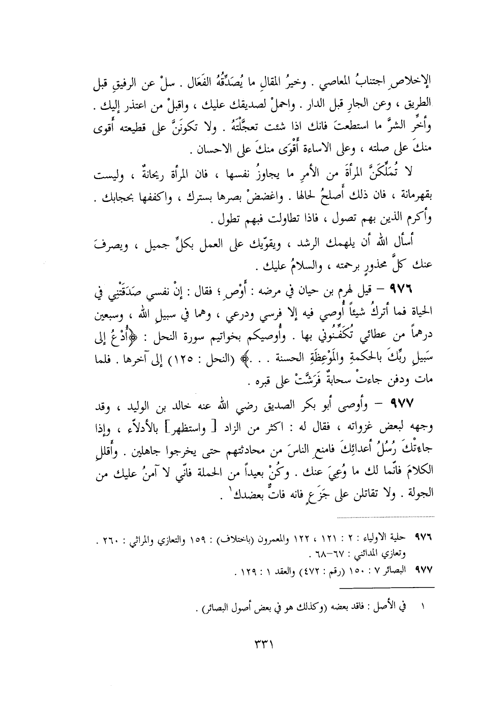 «976» - قيل لهرم بن حيان في مرضه: أوص؛ فقال: إن نفسي صدقتني في الحياة فما أترك شيئا أوصي فيه إلا فرسي ودرعي، وهما في سبيل الله، وسبعين درهما من عطائي تكفّنوني بها. وأوصيكم بخواتيم سورة النحل: (ادْعُ إِلى سَبِيلِ رَبِّكَ بِالْحِكْمَةِ وَالْمَوْعِظَةِ الْحَسَنَةِ ... )