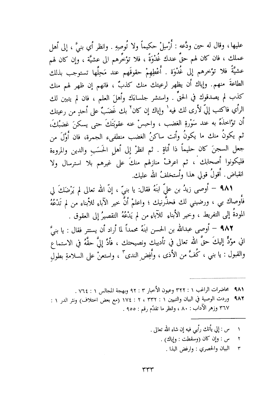 «981» - أوصى زيد بن عليّ ابنه فقال: يا بنيّ، إنّ الله تعالى لم يرضك لي فأوصاك بي، ورضيني لك فحذّرنيك؛ واعلم أنّ خير الآباء للأبناء من لم تدعه المودة إلى التفريط، وخير الأبناء للآباء من لم يدعه التقصير إلى العقوق.