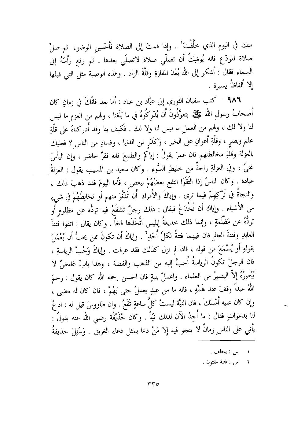 986- كتب سفيان الثوري إلى عبّاد بن عباد: أما بعد فانّك في زمان كان أصحاب رسول الله صلّى الله عليه وسلم يتعوّذون أن يدركوه في ما بلغنا، ولهم من العزم ما ليس لنا ولا لك، ولهم من العمل ما ليس لنا ولا لك. فكيف بنا وقد أدركناه على قلّة علم وبصر، وقلّة أعوان على الخير، وكدر من الدنيا، وفساد من الناس؟ فعليك بالعزلة وقلة مخالطتهم فان عمر يقول: إياكم والطمع فانه فقر حاضر، وإن اليأس غنى، وفي العزلة راحة من خليط السّوء. وكان سعيد بن المسيب يقول: العزلة عبادة. وكان الناس إذا التقوا انتفع بعضهم ببعض، فأما اليوم فقد ذهب ذلك، والنجاة في تركهم فيما ترى. وإياك والأمراء أن تدنو منهم أو تخالطهم في شيء من الأشياء. وإياك أن تخدع فيقال: ذلك رجل تشفع فيه تردّه عن مظلوم أو تردّه عن مظلمة، وإنما ذلك خديعة إبليس اتّخذها فخا. وكان يقال: اتقوا فتنة العابد وفتنة العالم فان فيهما فتنة لكلّ أحد [2] . وإياك أن تكون ممن يحبّ أن يعمل بقوله أو يسمع من قوله، فاذا لم تزل كذلك فقد عرفت. وإياك وحبّ الرياسة، فان الرجل تكون الرياسة أحبّ إليه من الذهب والفضة، وهذا باب غامض لا يبصره إلّا البصير من العلماء. واعمل بنية فان الحسن رحمه الله كان يقول: رحم الله عبدا وقف عند همّه، فانه ما من عبد يعمل حتى يهمّ، فان كان له مضى، وإن كان عليه أمسك، فان النيّة ليست كلّ ساعة تقع. وان طاووس قيل له: ادع لنا بدعوات فقال: ما أجد الآن لذلك نيّة. وكان حذيفة رضي الله عنه يقول: