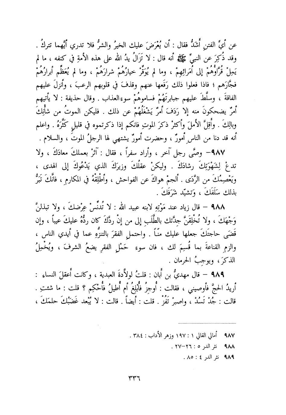 «987» - وصّى رجل آخر، وأراد سفرا، فقال: آثر بعملك معادك، ولا تدع لشهوتك رشادك. وليكن عقلك وزيرك الذي يدعوك إلى الهدى، ويعصمك من الرّدى. ألجم هواك عن الفواحش، وأطلقه في المكارم، فانّك تبرّ بذلك سلفك، وتشيّد شرفك.