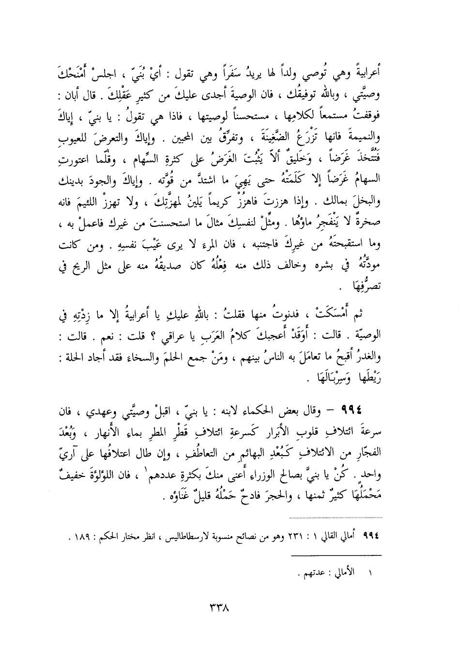 ثم أمسكت، فدنوت منها فقلت: بالله عليك يا أعرابية إلا ما زدته في الوصيّة. قالت: أوقد أعجبك كلام العرب يا عراقي؟ قلت: نعم. قالت: