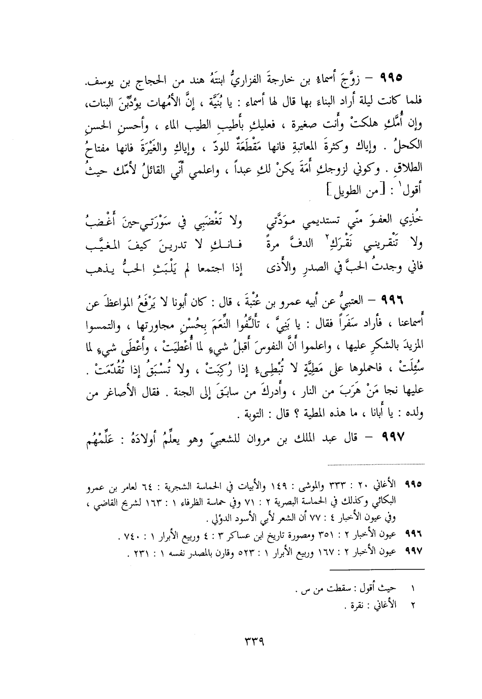 فلما كانت ليلة أراد البناء بها قال لها أسماء: يا بنيّة، إنّ الأمهات يؤدّبن البنات، وإن أمّك هلكت وأنت صغيرة، فعليك بأطيب الطيب الماء، وأحسن الحسن الكحل. وإياك وكثرة المعاتبة فانها مقطعة للودّ، وإياك والغيرة فانها مفتاح الطلاق. وكوني لزوجك أمة يكن لك عبدا، واعلمي أنّي القائل لأمّك حيث أقول [1] : [من الطويل]