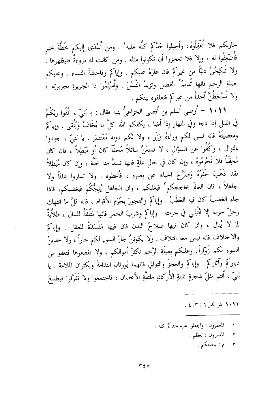«1011» - أوصى أسلم بن أفصى الخزاعيّ بنيه فقال: يا بنيّ، اتّقوا ربكم في الليل إذا دجا وفي النهار إذا أضا، يكفكم الله كلّ ما يخاف ويتّقى. وإياكم ومعصيته فانه ليس لكم وراءه وزر، ولا لكم دونه معتصر. يا بنيّ، جودوا بالنوال، وكفّوا عن السؤال، لا تمنعنّ سائلا محقّا كان أو مبطلا، فان كان محقّا فلا تحرموه، وإن كان في حال علّة فانها تسدّ منه خلّة، وإن كان مبطلا فقد ذهب خفره وصرّح الحياء عن بصره، فأعطوه. ولا تماروا عالما ولا جاهلا، فان العالم يحاججكم [3] فيغلبكم، وان الجاهل يلجّكم فيغضبكم، فاذا جاء الغضب كان فيه العطب. وإياكم والفجور بحرم الأقوام، فانه قلّ ما انتهك رجل حرمة إلا ابتلي في حرمته. وإياكم وشرب الخمر فانها متلفة للمال، طلّابة لما لا ينال، وان كان فيها صلاح البدن فان فيها مفسدة للعقل. وإياكم والاختلاف فانه ليس معه ائتلاف. ولا يكوننّ جار السوء لكم جارا، ولا خدين السوء لكم زوّارا. وعليكم بصلة الرّحم تكثر أموالكم، ولا تقطعوها فتفو من دياركم وآثاركم. وإياكم والعجز والتواني فانهما يورثان الندامة ويكثران الملامة. يا بنيّ، أنتم مثل شجرة ثابتة الأركان ملتفّة الأغصان، فاجتمعوا ولا تفرّقوا فيطمع