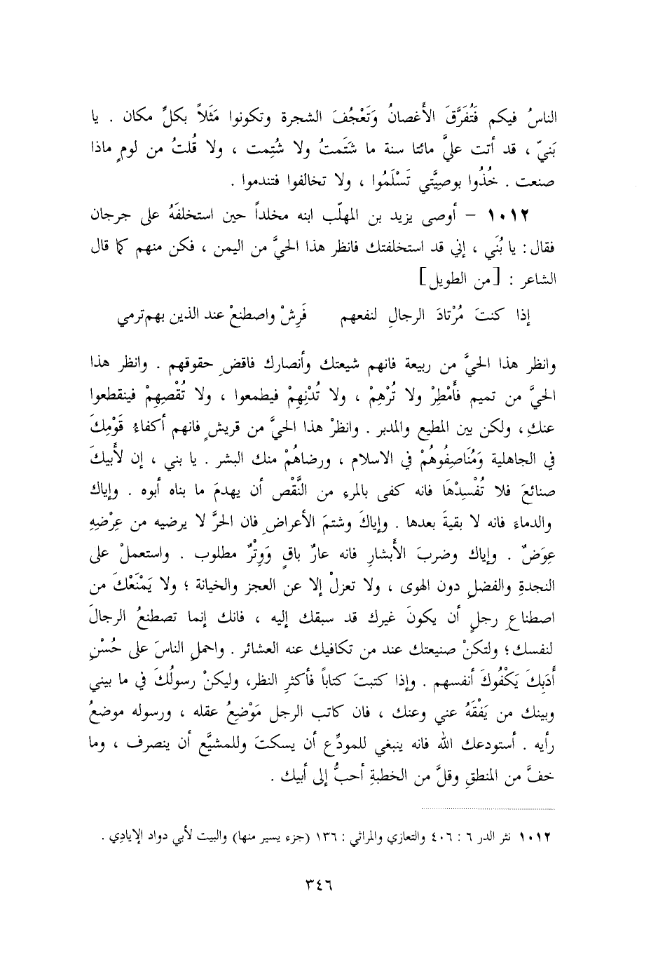 «1012» - أوصى يزيد بن المهلّب ابنه مخلدا حين استخلفه على جرجان فقال: يا بني، إني قد استخلفتك فانظر هذا الحيّ من اليمن، فكن منهم كما قال الشاعر: [من الطويل]