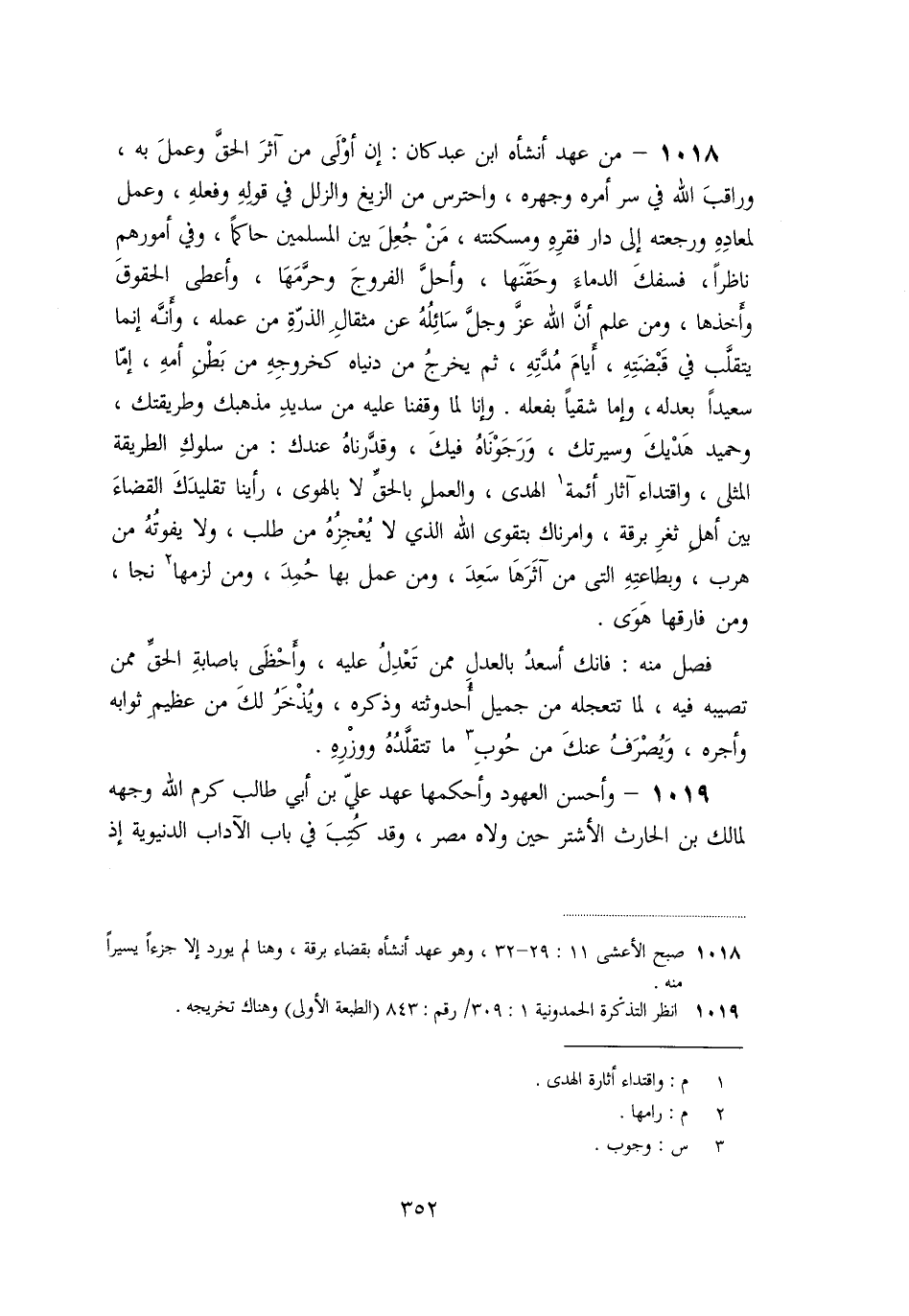 «1019» - وأحسن العهود وأحكمها عهد عليّ بن أبي طالب كرم الله وجهه لمالك بن الحارث الأشتر حين ولاه مصر، وقد كتب في باب الآداب الدنيوية إذ