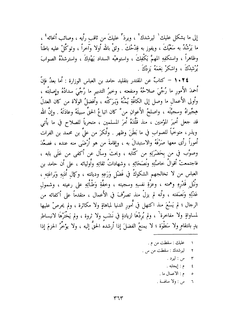 1024- كتاب عن المقتدر بتقليد حامد بن العباس الوزارة: أما بعد فإنّ أحمد الأمور ما رجّي صلاحه ومنفعته، وخير التدبير ما رجّي سداده وإصابته، وأولى الأعمال ما وصل إلى الكافّة يمنه وبركته، وأفضل الولاة من كان العدل هجّيراه وسجيّته، واصلح الأعوان من [5] كان اتباع الحقّ سبيله وعادته. وإنّ الله قد جعل أمير المؤمنين، منذ قلّده أمر المسلمين، متحريا للصلاح في ما يأتي ويذر، متوخّيا للصواب في ما بطن وظهر. وأنكر من عليّ بن محمد بن الفرات أمورا رأى معها صرفه والاستبدال به، وإقامة من هو أرضى منه عنده، فصعّد وصوّب في من بحضرته من كتّابه، وبحث وسأل عن أكفى من على بابه، فاجتمعت أقوال خاصّته ونصحائه، وشهادات ثقاته وأوليائه، على أن حامد بن العباس من لا تخالجهم الشكوك في فضل ورعه وديانته، وكمال أدبه وبراعته، ونبل قدره وهمته، وعزّة نفسه وسجيته، وخفّة وطأته على رعيته، وشمول عدله ونصفته، وأنه لم يزل منذ تصرّف في الأعمال، متقدما على أكفائه من الرجال؛ لم يسع منذ اكتهل في أمور الدنيا لمباهاة ولا مكاثرة، ولم يحرص عليها لمساواة ولا مفاخرة [6] ، ولم يردها لزيادة في نشب ولا ثروة، ولم يخترها لانبساط يد بانتقام ولا سطوة؛ لا يمنع الفضل إذا أرشده الحقّ إليه، ولا يؤخّر الحزم إذا