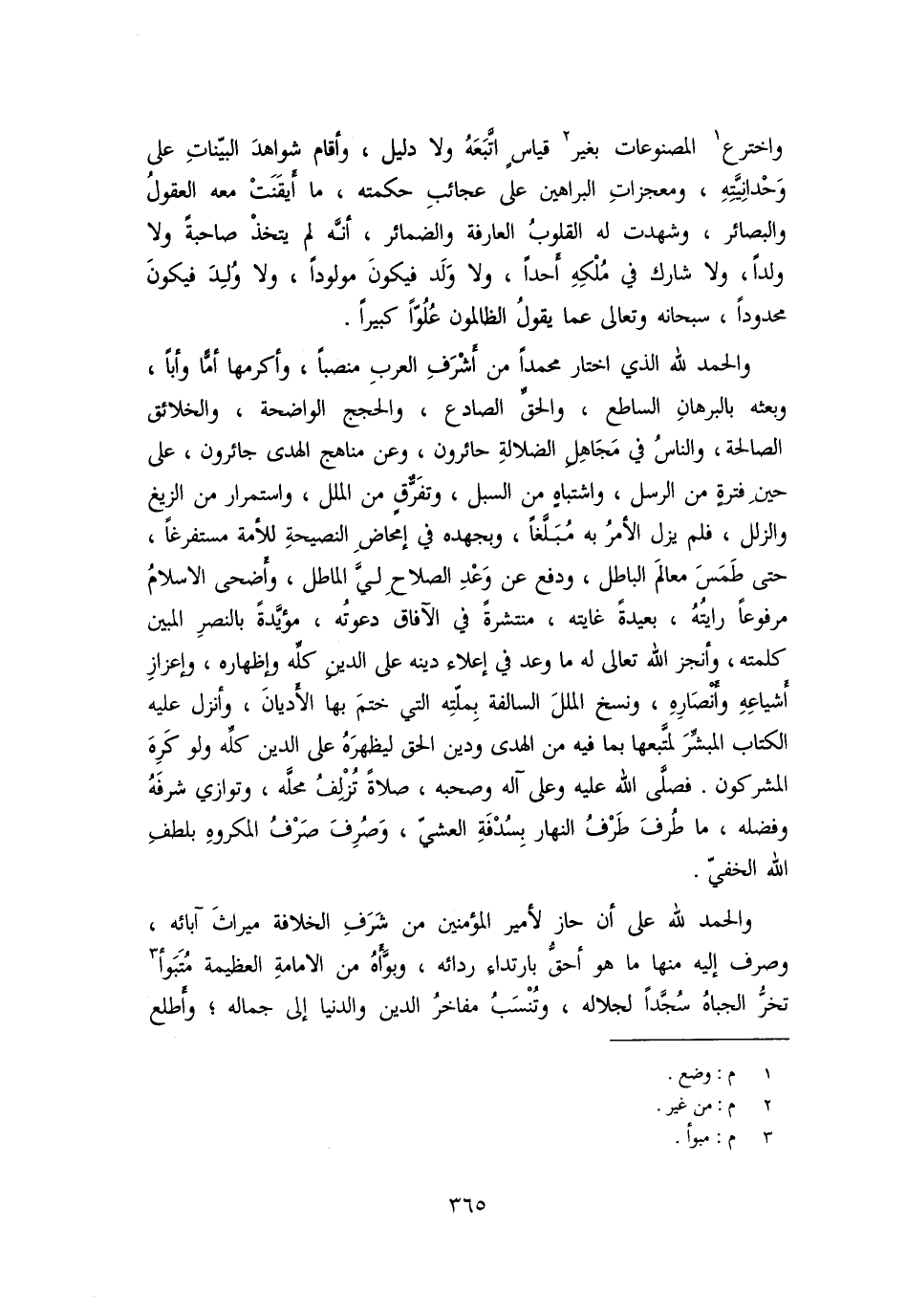 واخترع [1] المصنوعات بغير [2] قياس اتّبعه ولا دليل، وأقام شواهد البيّنات على وحدانيّته، ومعجزات البراهين على عجائب حكمته، ما أيقنت معه العقول والبصائر، وشهدت له القلوب العارفة والضمائر، أنّه لم يتخذ صاحبة ولا ولدا، ولا شارك في ملكه أحدا، ولا ولد فيكون مولودا، ولا ولد فيكون محدودا، سبحانه وتعالى عما يقول الظالمون علوّا كبيرا.