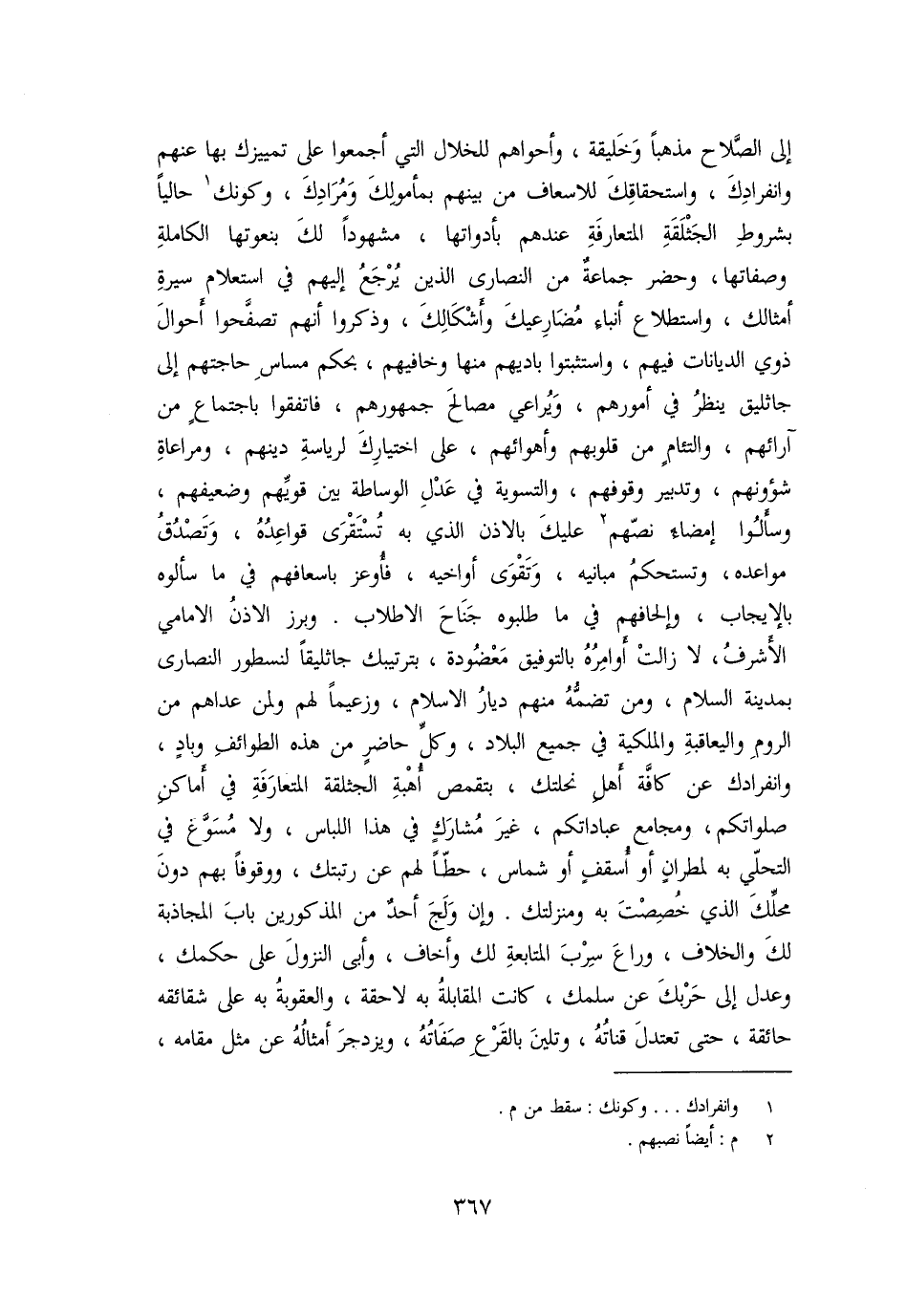 إلى الصّلاح مذهبا وخليقة، وأحواهم للخلال التي أجمعوا على تمييزك بها عنهم وانفرادك، واستحقاقك للاسعاف من بينهم بمأمولك ومرادك، وكونك [1] حاليا بشروط الجثلقة المتعارفة عندهم بأدواتها، مشهودا لك بنعوتها الكاملة وصفاتها، وحضر جماعة من النصارى الذين يرجع إليهم في استعلام سيرة أمثالك، واستطلاع أنباء مضارعيك وأشكالك، وذكروا أنهم تصفّحوا أحوال ذوي الديانات فيهم، واستثبتوا باديهم منها وخافيهم، بحكم مساس حاجتهم إلى جاثليق ينظر في أمورهم، ويراعي مصالح جمهورهم، فاتفقوا باجتماع من آرائهم، والتئام من قلوبهم وأهوائهم، على اختيارك لرياسة دينهم، ومراعاة شؤونهم، وتدبير وقوفهم، والتسوية في عدل الوساطة بين قويّهم، وضعيفهم، وسألوا إمضاء نصّهم [2] عليك بالاذن الذي به تستقرى قواعده، وتصدق مواعده، وتستحكم مبانيه، وتقوى أواخيه، فأوعز باسعافهم في ما سألوه بالإيجاب، وإلحافهم في ما طلبوه جناح الاطلاب. وبرز الاذن الامامي الأشرف، لا زالت أوامره بالتوفيق معضودة، بترتيبك جاثليقا لنسطور النصارى بمدينة السلام، ومن تضمّه منهم ديار الاسلام، وزعيما لهم ولمن عداهم من الروم واليعاقبة والملكية في جميع البلاد، وكلّ حاضر من هذه الطوائف وباد، وانفرادك عن كافّة أهل نحلتك، بتقمص أهبة الجثلقة المتعارفة في أماكن صلواتكم، ومجامع عباداتكم، غير مشارك في هذا اللباس، ولا مسوّغ في التحلّي به لمطران أو أسقف أو شماس، حطّا لهم عن رتبتك، ووقوفا بهم دون محلّك الذي خصصت به ومنزلتك. وإن ولج أحد من المذكورين باب المجاذبة لك والخلاف، وراع سرب المتابعة لك وأخاف، وأبى النزول على حكمك، وعدل إلى حربك عن سلمك، كانت المقابلة به لاحقة، والعقوبة به على شقائقه حائقة، حتى تعتدل قناته، وتلين بالقرع صفاته، ويزدجر أمثاله عن مثل مقامه،