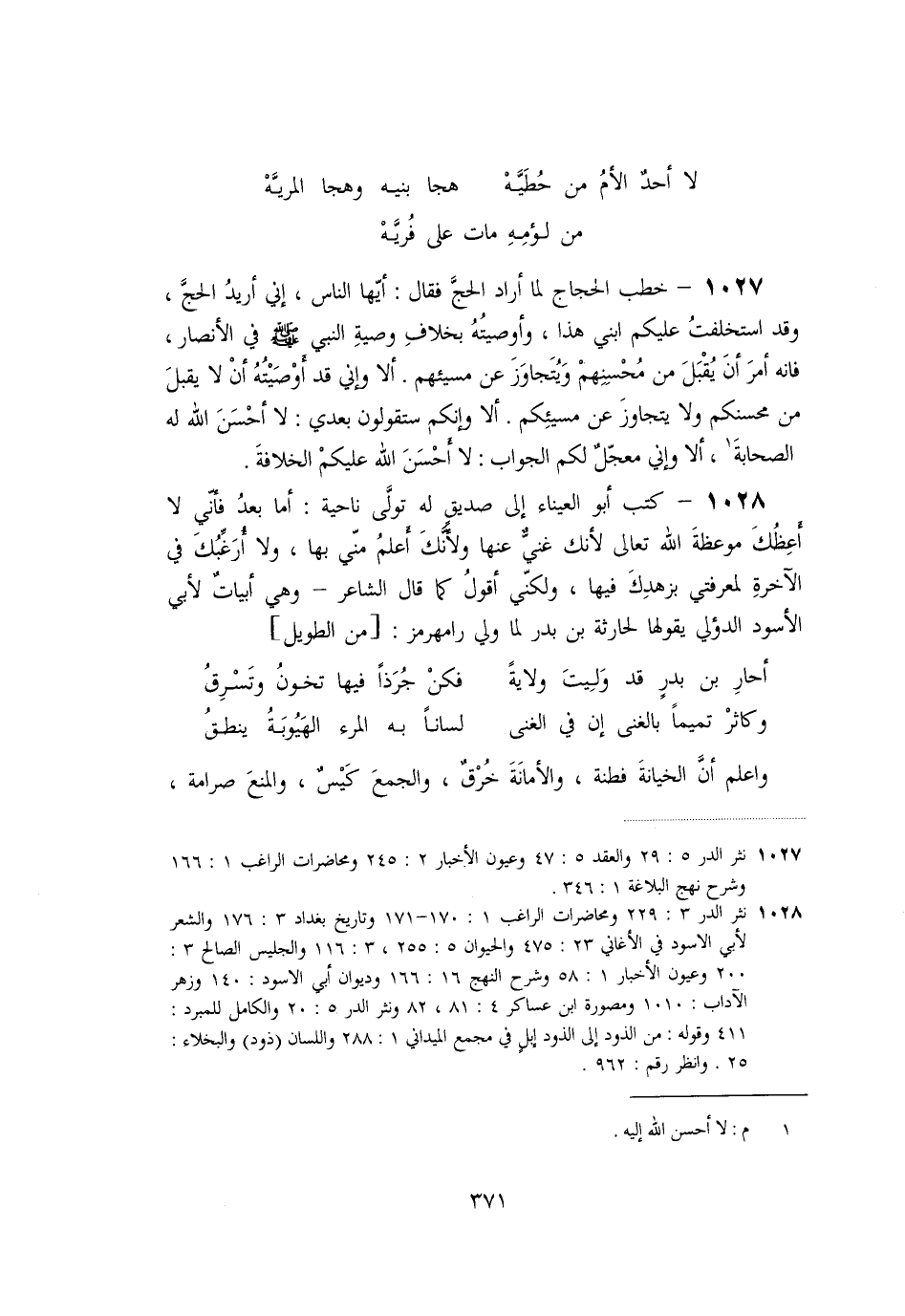 «1027» - خطب الحجاج لما أراد الحجّ فقال: أيّها الناس، إني أريد الحجّ، وقد استخلفت عليكم ابني هذا، وأوصيته بخلاف وصية النبي صلّى الله عليه وسلم في الأنصار، فانه أمر أن يقبل من محسنهم ويتجاوز عن مسيئهم. ألا وإني قد أوصيته أن لا يقبل من محسنكم ولا يتجاوز عن مسيئكم. ألا وإنكم ستقولون بعدي: لا أحسن الله له الصحابة [1] ، ألا وإني معجّل لكم الجواب: لا أحسن الله عليكم الخلافة.