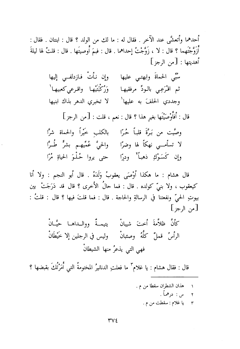 قال هشام: ما هكذا أوصى يعقوب ولده. قال أبو النجم: ولا أنا كيعقوب، ولا بني كولده. قال: فما حال الأخرى؟ قال قد درجت بين بيوت الحيّ ونفعتنا في الرسالة والحاجة. قال: فما قلت فيها؟ قال: قلت: