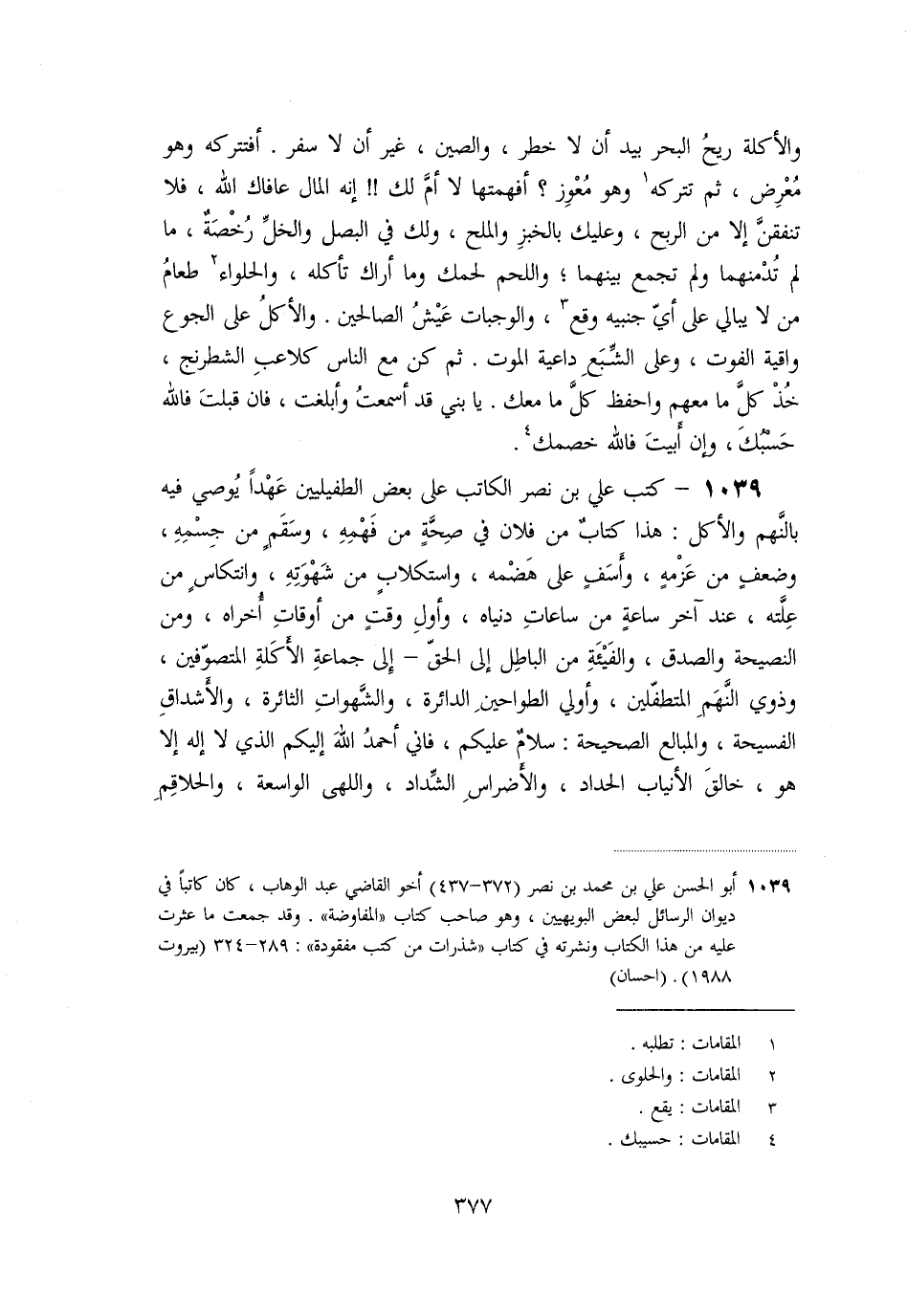 «1039» - كتب علي بن نصر الكاتب على بعض الطفيليين عهدا يوصي فيه بالنّهم والأكل: هذا كتاب من فلان في صحّة من فهمه، وسقم من جسمه، وضعف من عزمه، وأسف على هضمه، واستكلاب من شهوته، وانتكاس من علّته، عند آخر ساعة من ساعات دنياه، وأول وقت من أوقات أخراه، ومن النصيحة والصدق، والفيئة من الباطل إلى الحقّ- إلى جماعة الأكلة المتصوّفين، وذوي النّهم المتطفّلين، وأولي الطواحين الدائرة، والشّهوات الثائرة، والأشداق الفسيحة، والمبالع الصحيحة: سلام عليكم، فاني أحمد الله إليكم الذي لا إله إلا هو، خالق الأنياب الحداد، والأضراس الشّداد، واللهى الواسعة، والحلاقم