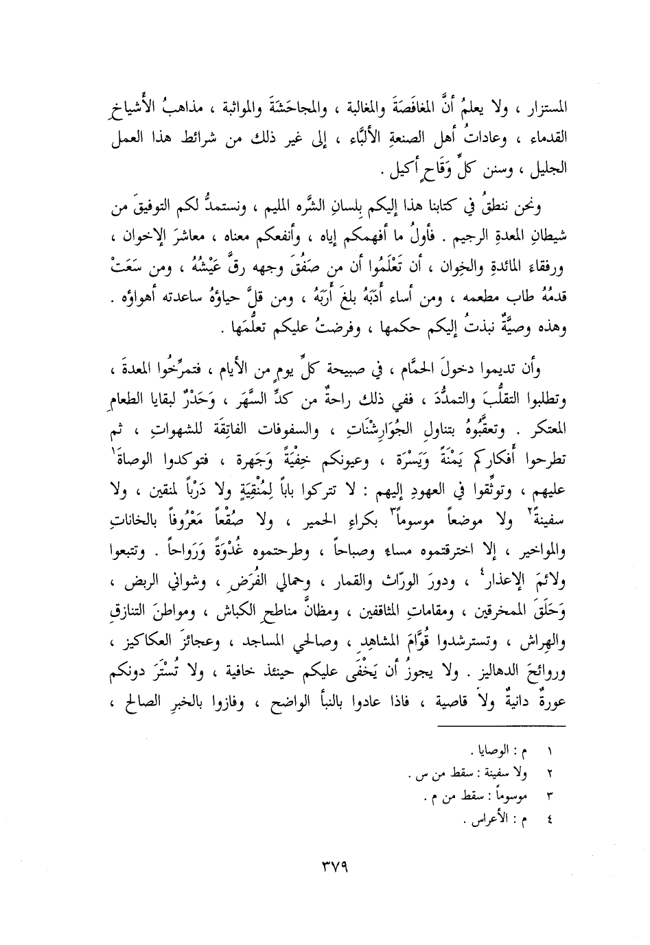 وأن تديموا دخول الحمّام، في صبيحة كلّ يوم من الأيام، فتمرّخوا المعدة، وتطلبوا التقلّب والتمدّد، ففي ذلك راحة من كد السّهر، وحدر لبقايا الطعام المعتكر. وتعقّبوه بتناول الجوارشنات، والسفوفات الفاتقة للشهوات، ثم تطرحوا أفكاركم يمنة ويسرة، وعيونكم خفية وجهرة، فتوكدوا الوصاة [1] عليهم، وتوثّقوا في العهود إليهم: لا تتركوا بابا لمنقية ولا دربا لمنقين، ولا سفينة [2] ولا موضعا موسوما [3] بكراء الحمير، ولا صقعا معروفا بالخانات والمواخير، إلا اخترقتموه مساء وصباحا، وطرحتموه غدوة ورواحا. وتتبعوا ولائم الإعذار [4] ، ودور الورّاث والقمار، وحمالي الفرض، وشواني الربض، وحلق الممخرقين، ومقامات المثاقفين، ومظانّ مناطح الكباش، ومواطن التنازق والهراش، وتسترشدوا قوّام المشاهد، وصالحي المساجد، وعجائز العكاكيز، وروائح الدهاليز. ولا يجوز أن يخفى عليكم حينئذ خافية، ولا تستر دونكم عورة دانية ولا قاصية، فاذا عادوا بالنبأ الواضح، وفازوا بالخبر الصالح،