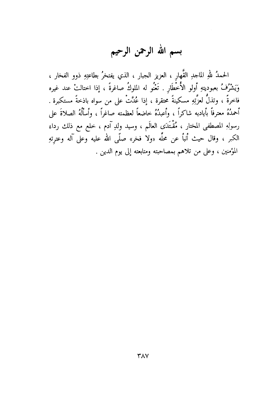 الحمد لله الماجد القّهار، العزيز الجبار، الذي يفتخر بطاعته ذوو الفخار، ويشرف بعبوديته أولو الأخطار. تعنو له الملوك صاغرة، إذا اختالت عند غيره فاخرة، وتذلّ لعزّته مسكينة محتقرة، إذا عدّت على من سواه باذخة مستكبرة.