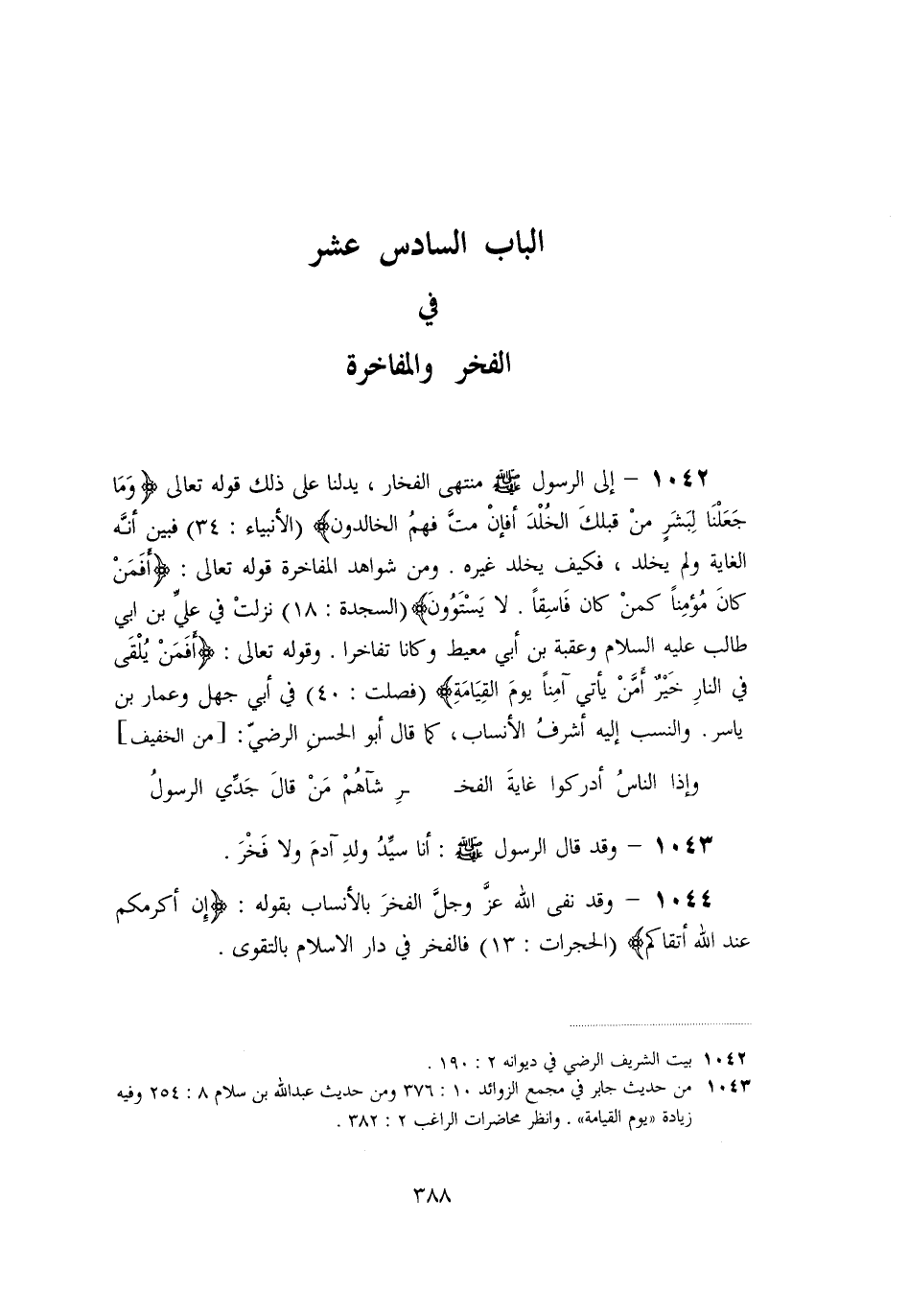 «1042» - إلى الرسول صلّى الله عليه وسلم منتهى الفخار، يدلنا على ذلك قوله تعالى (وَما جَعَلْنا لِبَشَرٍ مِنْ قَبْلِكَ الْخُلْدَ أَفَإِنْ مِتَّ فَهُمُ الْخالِدُونَ)