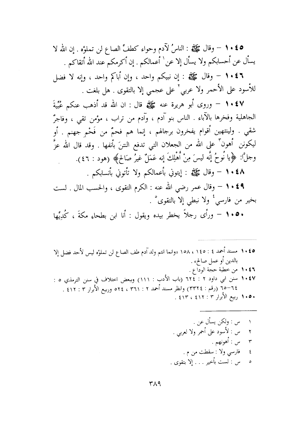 «1045» - وقال صلّى الله عليه وسلم: الناس لآدم وحواء كطفّ الصاع لن تملؤه. إن الله لا يسأل عن أحسابكم ولا يسأل إلا عن [1] أعمالكم. إن أكرمكم عند الله أتقاكم.