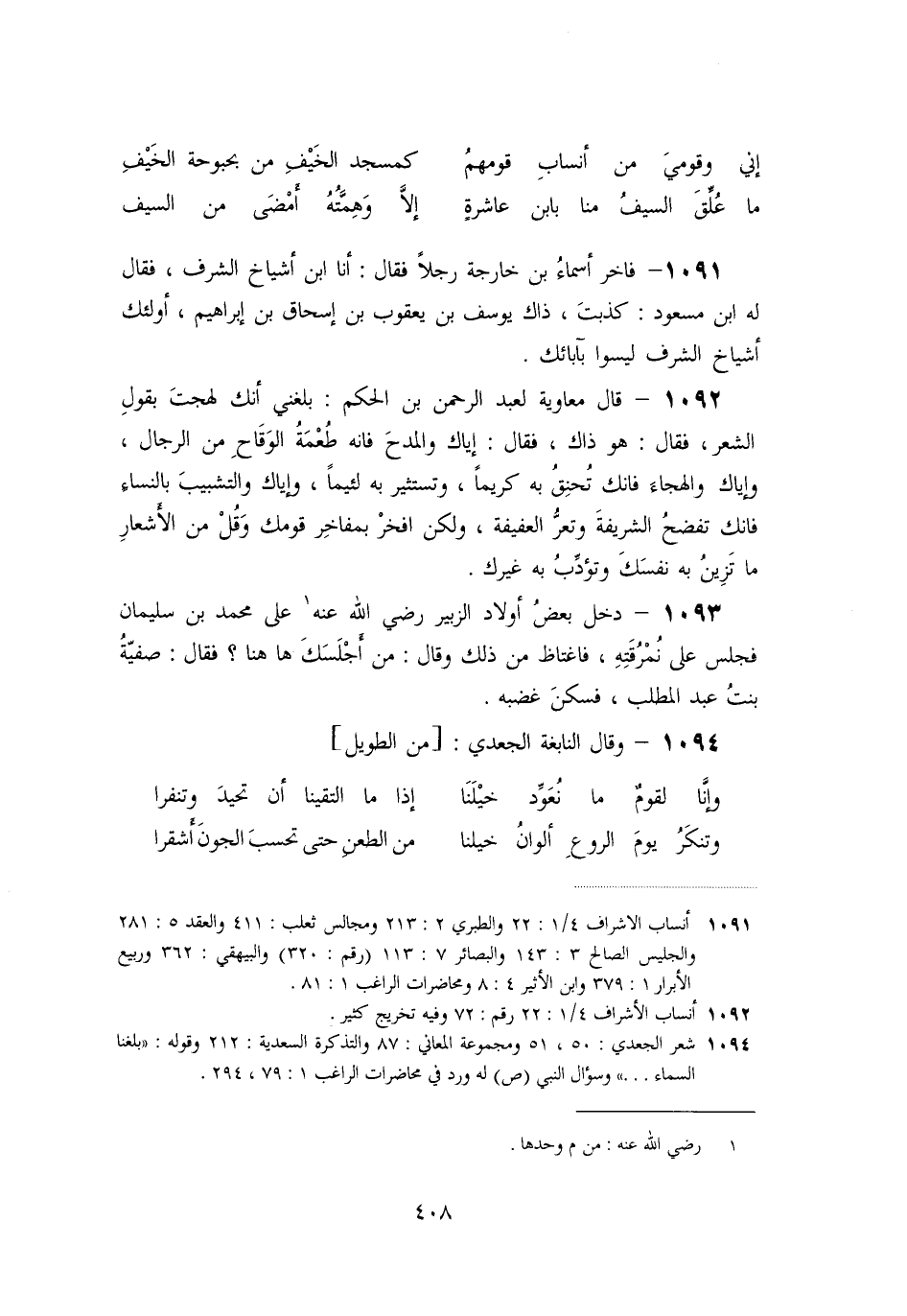 «1091» - فاخر أسماء بن خارجة رجلا فقال: أنا ابن أشياخ الشرف، فقال له ابن مسعود: كذبت، ذاك يوسف بن يعقوب بن إسحاق بن إبراهيم، أولئك أشياخ الشرف ليسوا بآبائك.