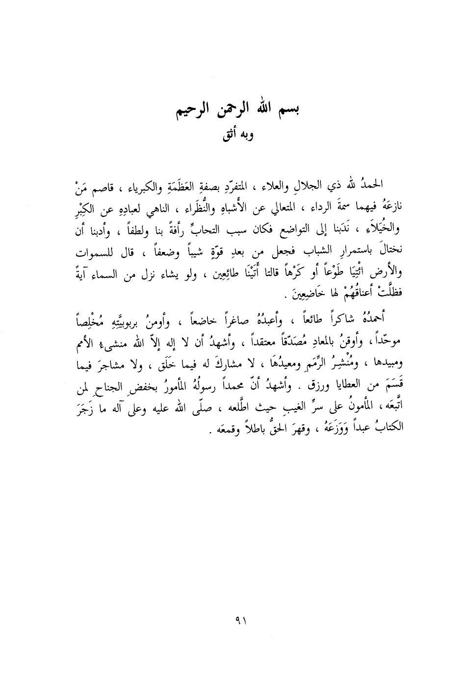 (وبه أثق) الحمد لله ذي الجلال والعلاء، المتفرّد بصفة العظمة والكبرياء، قاصم من نازعه فيهما سمة الرداء، المتعالي عن الأشباه والنّظراء، الناهي لعباده عن الكبر والخيلاء، ندبنا إلى التواضع فكان سبب التحابّ رأفة بنا ولطفا، وأدبنا أن نختال باستمرار الشباب فجعل من بعد قوّة شيبا وضعفا، قال للسموات والأرض ائتيا طوعا أو كرها قالتا أتينا طائعين، ولو يشاء نزل من السماء آية فظلّت أعناقهم لها خاضعين.