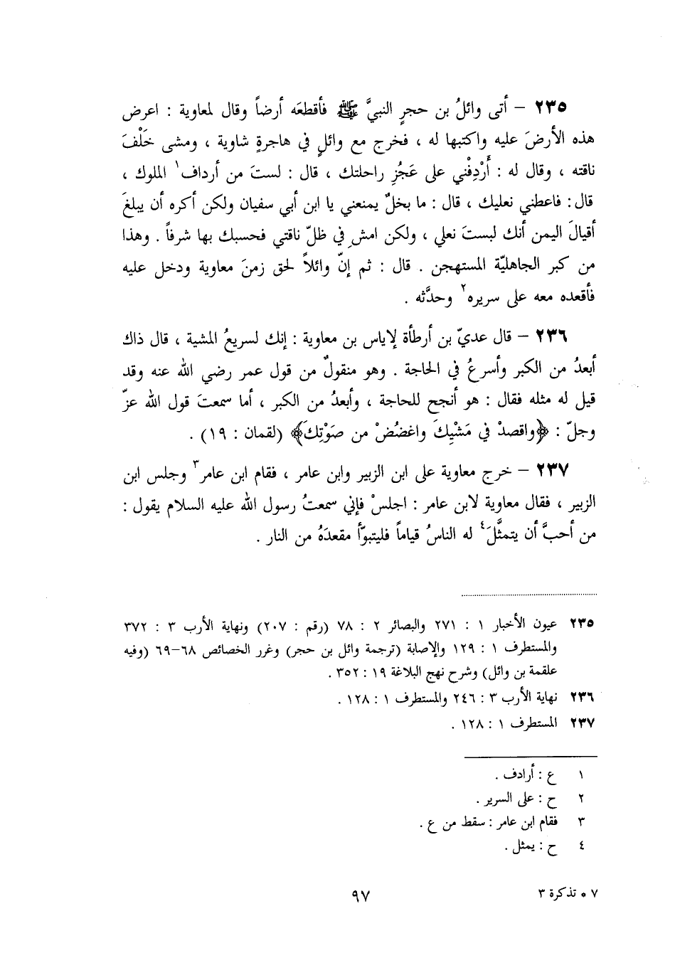 «235» - أتى وائل بن حجر النبيّ صلّى الله عليه وسلم فأقطعه أرضا وقال لمعاوية: اعرض هذه الأرض عليه واكتبها له، فخرج مع وائل في هاجرة شاوية، ومشى خلف ناقته، وقال له: أردفني على عجز راحلتك، قال: لست من أرداف [1] الملوك، قال: فاعطني نعليك، قال: ما بخل يمنعني يا ابن أبي سفيان ولكن أكره أن يبلغ أقيال اليمن أنك لبست نعلي، ولكن امش في ظلّ ناقتي فحسبك بها شرفا. وهذا من كبر الجاهليّة المستهجن. قال: ثم إنّ وائلا لحق زمن معاوية ودخل عليه فأقعده معه على سريره [2] وحدّثه.