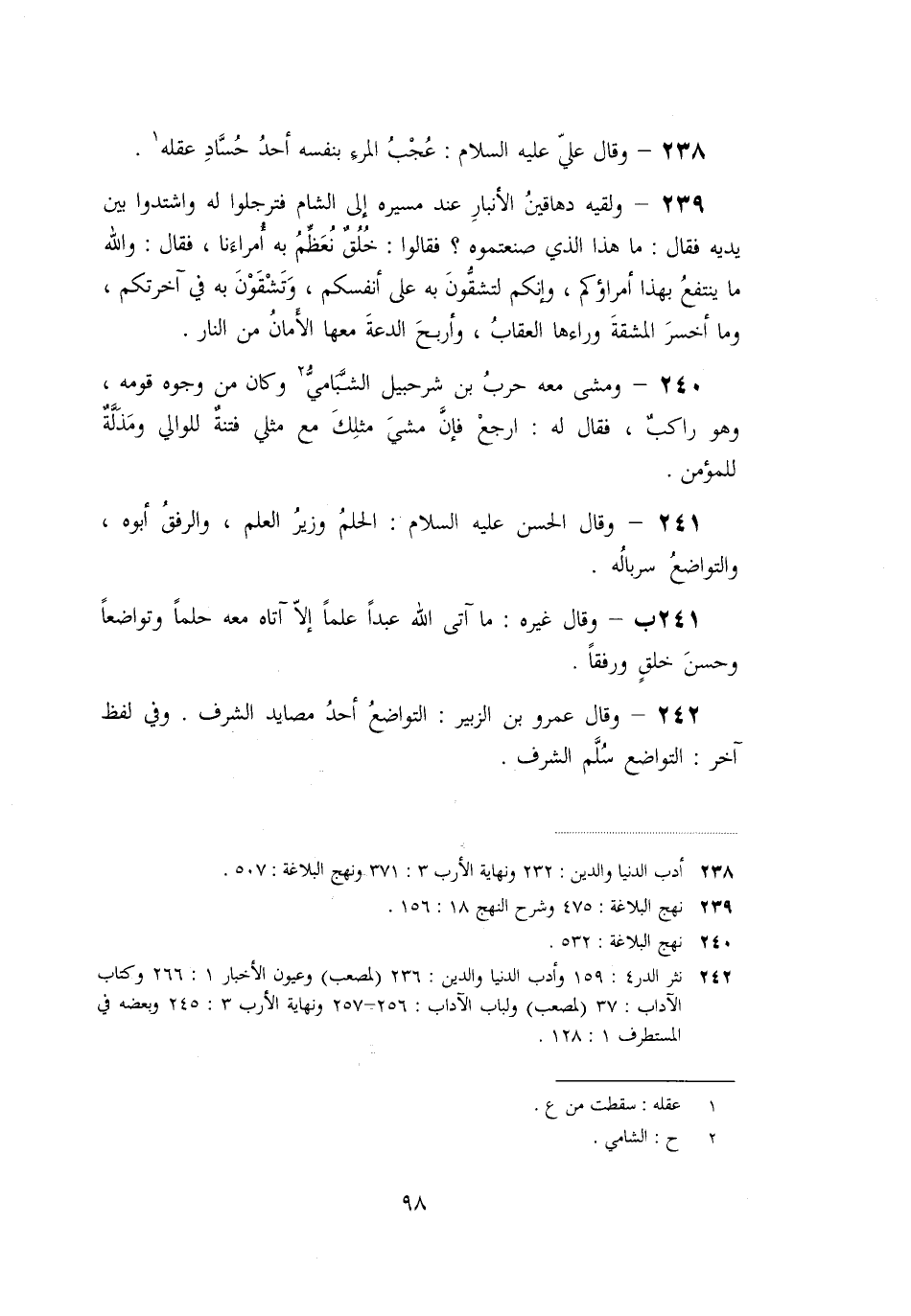 «240» - ومشى معه حرب بن شرحبيل الشبّاميّ [2] وكان من وجوه قومه، وهو راكب، فقال له: ارجع فإنّ مشي مثلك مع مثلي فتنة للوالي ومذلّة للمؤمن.