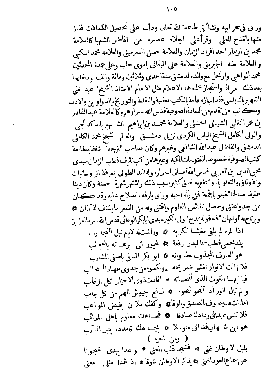 وربي في حجر أبيه ونشأ في طاعة الله تعالى ودأب على تحصيل الكمالات ففاز منها بالقدح المعلى وقرأ على أجلاء عصره من أفاضل الشهبا كالعلامة محمد بن الزمار أحد أفراد الزمان والعلامة حسن السرميني والعلامة محمد المكتبي والعلامة طه الجبريني والعلامة علي الميقاني بأموي حلب وعلى عمدة المحدثين محمد المواهبي وارتحل مع والده لدمشق سنة احدى وثلاثين ومائة وألف ودخلها بعد ذلك مراة واستجاز علماءها العلام مثل الامام الأستاذ الشيخ عبد الغني الشهير بالنابلسي فقد أجازه عامة بالكتب العقلية والنقلية والتواريخ والدواوين والأدب وكتب من تقدم من السادة الصوفية قدس الله أسرارهم وكالعلامة عبد القادر بن عمر التغلبي الشيباني الحنبلي والعلامة محمد بن إبراهيم الشهير بالدكدكجي والولي الكامل الشيخ الياس الكردي نزيل دمشق والعالم الشيخ محمد الكاملي الدمشقي والفاضل عبد الله الشافعي وغيرهم وكان صاحب الترجمة شغفاً بمطالعة كتب الصوفية خصوصاً الفتوحات المكية وغيرها من كتب تآليف قطب الزمان سيدي محيي الدين ابن العربي قدس الله تعالى أسراره وله اليد الطولى بمعرفة الروحانيات والأوفاق والتعاويذ وانتفع به خلق كثير بسبب ذلك واشتهر شهرة حسنة وكان ديناً عفيفاً صالحاً بقياً وبالجملة فمن رآه أحبه ورأى بارقة الصلاح عليه وقد كان ممن جد واعتنى وحصل نفائس العلوم واقتنى وله من الشعر ما يشنف الآذان ويرتاح له الولهان فمنه قوله يمدح الولي الكبير سيدي أبا بكر الوفائي قدس الله سره العزيز