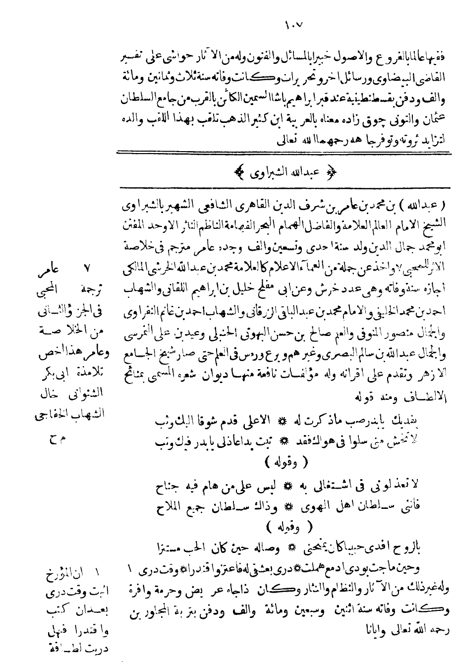 عبد الله بن محمد بن عامر بن شرف الدين القاهري الشافعي الشهير بالشبراوي الشيخ الامام العالم العلامة والفاضل الهمام البحر الفهامة الناظم الناثر الأوحد المفنن أبو محمد جمال الدين ولد سنة احدى وتسعين وألف وجده عامر مترجم في خلاصة الأثر للمحبي وأخذ عن جملة من العلماء الأعلام كالعلامة محمد بن عبد الله الخرشي المالكي أجازه سنة وفاته وهي عدد خرش وعن أبي مفلح خليل بن إبراهيم اللقاني والشهاب أحمد بن محمد الخليفي والامام محمد بن عبد الباقي الزرقاني والشهاب أحمد بن غانم النفراوي والجمال منصور المنوقي والعلم صالح بن حسن البهوتي الحنبلي وعيد بن علي النمرسي والجمال عبد الله بن سالم البصري وغيرهم وبرع ورؤس في العلم حتى صار شيخ الجامع الأزهر وتقدم على أقرانه وله مؤلفات نافعة منها ديوان شعره المسمى بمنائح الألطاف ومنه قوله