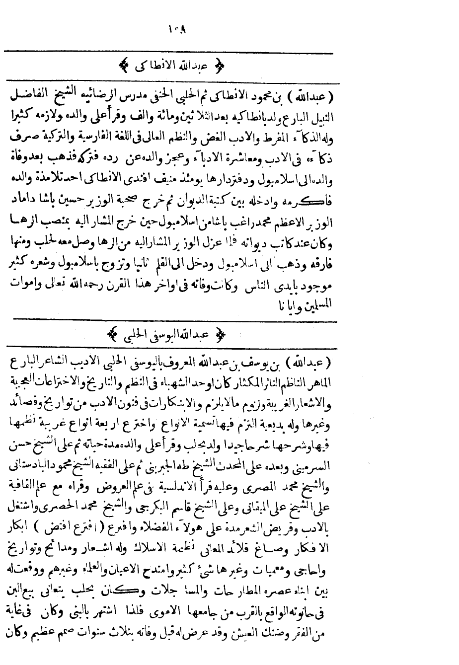 عبد الله بن محمود الأنطاكي ثم الحلبي الحنفي مدرس الرضائية الشيخ الفاضل النبيل البارع ولد بأنطاكية بعد الثلاثين ومائة وألف وقرأ على والده ولازمه كثيراً وله الذكاء المفرط والأدب الغض والنظم العالي في اللغة الفارسية والتركية صرف ذكاءه في الأدب ومعاشرة الأدباء وعجز والده عن رده فتركه فذهب بعد وفاة والده إلى اسلامبول ودفتر دارها يومئذ منيف أفندي الأنطاكي أحد تلامذة والده فأكرمه وأدخله بين كتبة الديوان ثم خرج صحبة الوزير حسين باشا داماد الوزير الأعظم محمد راغب باشا من اسلامبول حين خرج المشار إليه بمنصب الرها وكان عند كاتب ديوانه فلما عزل الوزير المشار إليه من الرها وصل معه لحلب ومنها فارقه وذهب إلى اسلامبول ودخل إلى القلم ثانياً وتزوج باسلامبول وشعره كثير موجود بأيدي الناس وكانت وفاته في أواخر هذا القرن رحمه الله تعالى وأموات المسلمين وإيانا.