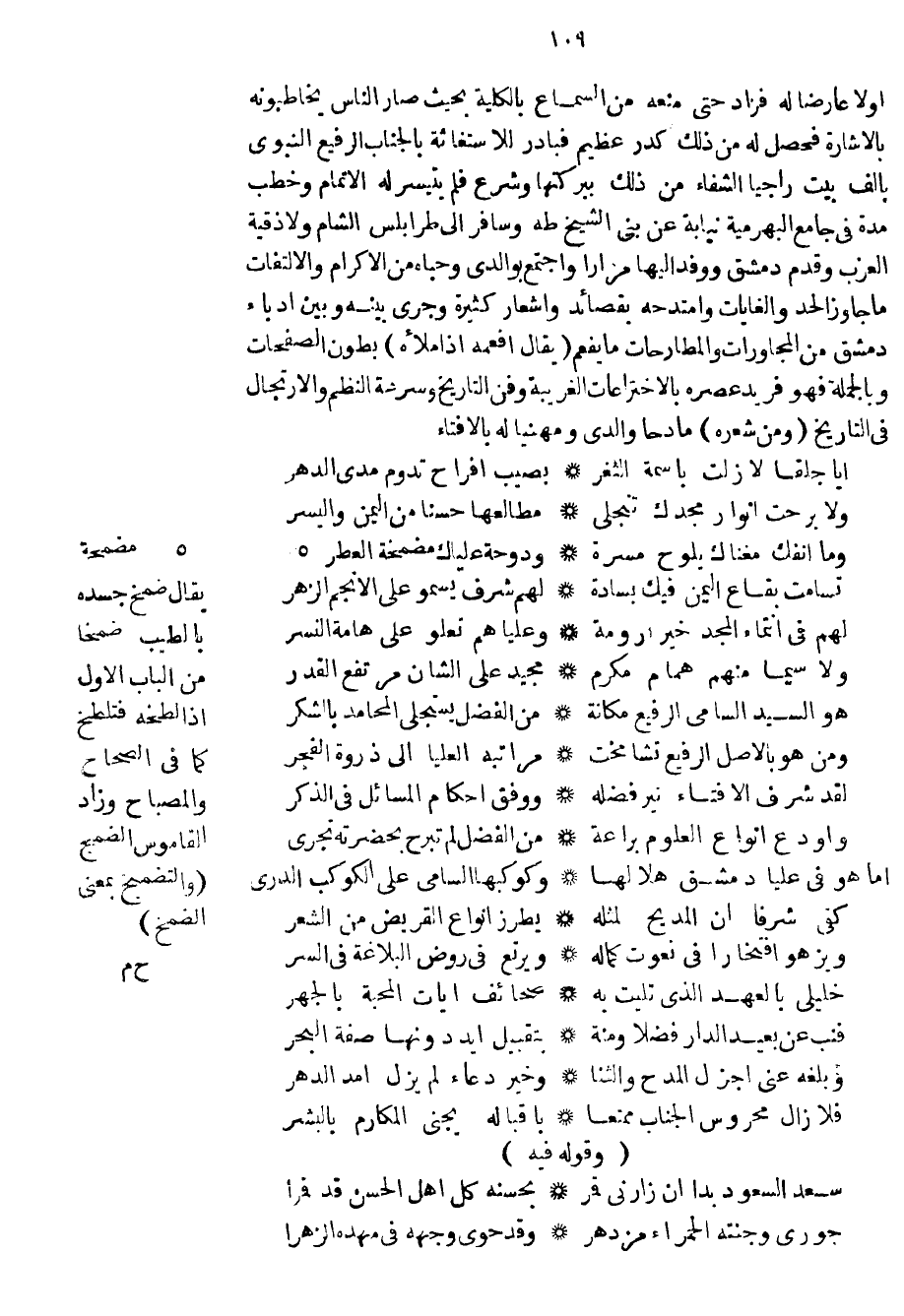 أولاً عارضاً له فزاد حتى منعه من السماع بالكلية بحيث صار الناس يخاطبونه بالاشارة فحصل له من ذلك كدر عظيم فبادر للاستغاثة بالجناب الرفيع النبوي بألف بيت راجياً الشفاء من ذلك ببركتها وشرع فلم يتيسر له الاتمام وخطب مدة في جامع البهرمية نيابة عن بني الشيخ طه وسافر إلى طرابلس الشام ولاذقية العرب وقدم دمشق ووفد اليها مراراً واجتمع بوالدي وحباه من الاكرام والالتفات ما جاوز الحد والغايات وامتدحه بقصائد وأشعار كثيرة وجرى بينه وبين ادباء دمشق من المجاورات والمطارحات ما يفعم يقال أفعمه إذا ملأه بطون الصفحات وبالجملة فهو فريد عصره بالاختراعات الغريبة وفن التاريخ وسرعة النظم والارتجال في التاريخ ومن شعره مادحاً والدي ومهنياً له بالافتاء