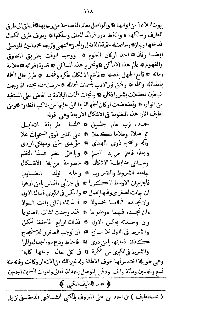 بيوت البلاغة من أبوابها والواصل معالم الفصاحة من رحابها تسلق إلى طرق المعارف وسلكها والتقط درر فرائد المعالي وسلكها وعرف طرق الكمال فدخلها وجاز وساغت له حقيقة الفضل والمجاز انتهى وترجمه محمد أمين الموصلي أيضاً وقال أحد أركان العلوم ووحيد الوقت بطريق المنطوق والمفهوم عالم هذه الأماكن ونحرير هذه المساكن قدوة أقرانه علامة زمانه قامع الجهل بفضله قاشع الأشكال بفكره وفهمه طرز حلل العلماء بفضائله وعلمه وفتق نور الأدب بنسمات شمائله حرست سماء مجده إذ رجمت شياطين المعضلات بشرر أفكاره وانجلت ظلمات البلادة بما أفاض على المستفيد من أنواره وتضعضعت أركان الجهالة بما ألقى عليها من مناكب أنظاره ومن لطيف آثاره هذه المنظومة في الأشكال الأربعة وهي قوله
